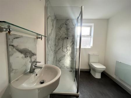 Featuring a three piece suite finished in white, comprising a step-in shower, a low flush W.C and a was hand basin. The room has partial panelling to the walls, an electric storage heater and a rear facing obscure double glazed window. There is a useful storage/airing cupboard.