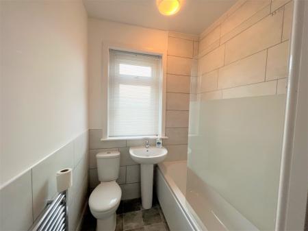 Presented with a three piece suite finished in white, comprising a panelled bath with a shower over, a pedestal wash hand basin and a low flush W.C. The room has an obscure double glazed window, partial tiling to the wall, a chrome towel radiator, a spot light to the ceiling and a useful storage/airing cupboard.