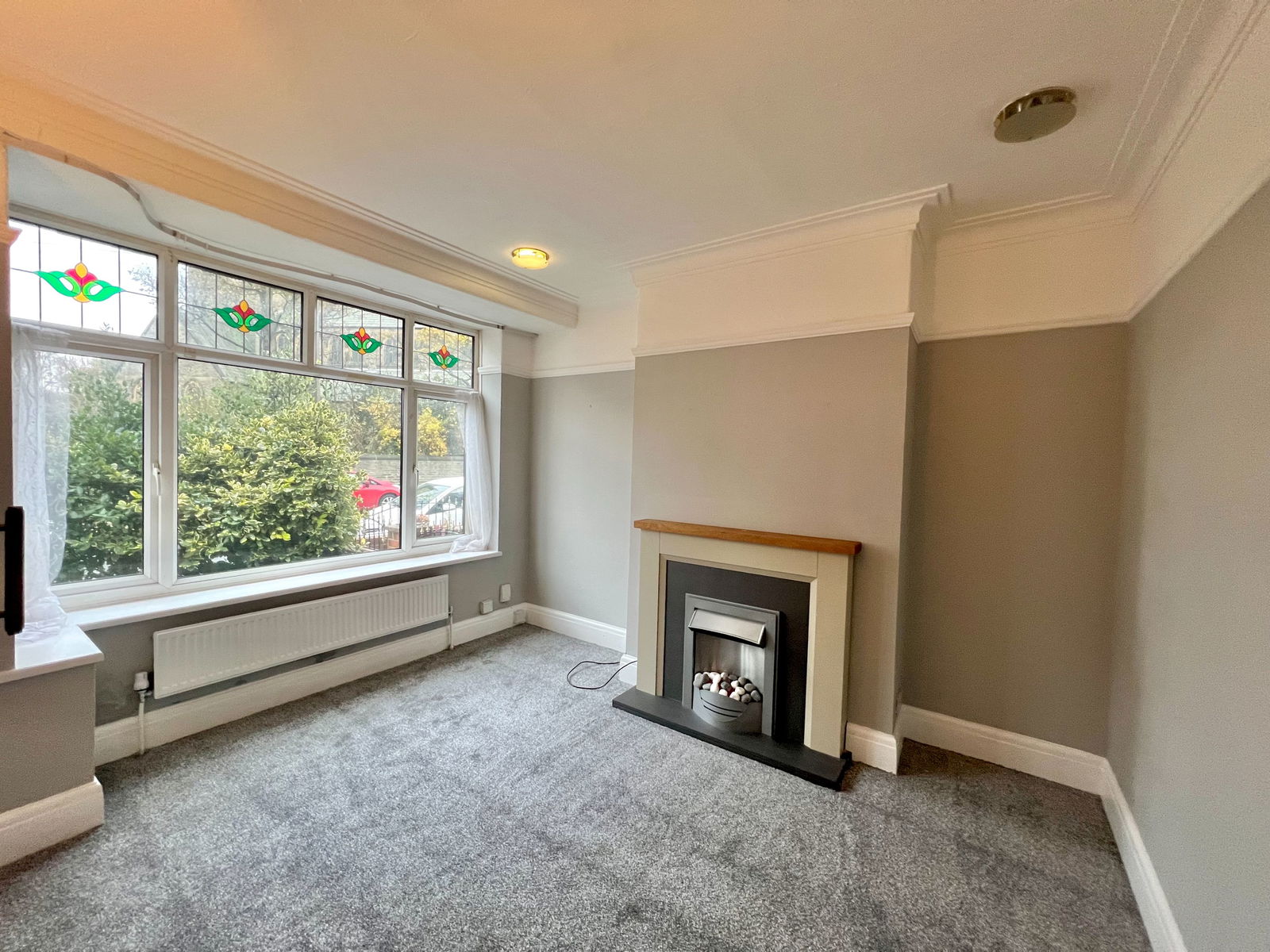 A front facing principal reception room having large double glazed window, radiator, decorative coving, and focal point fireplace with living flame gas fire.