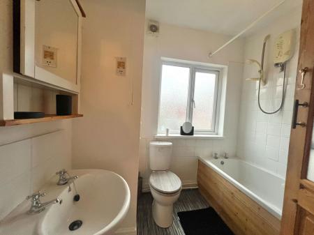 Having a three piece white suite comprising of a low flush WC, pedestal wash hand basin and panelled bath with electric shower over. There is a frosted double glazed window, airing cupboard housing the cylinder tank and providing storage, vinyl finish to floor, chrome heated ladder radiator and part tiling to walls.