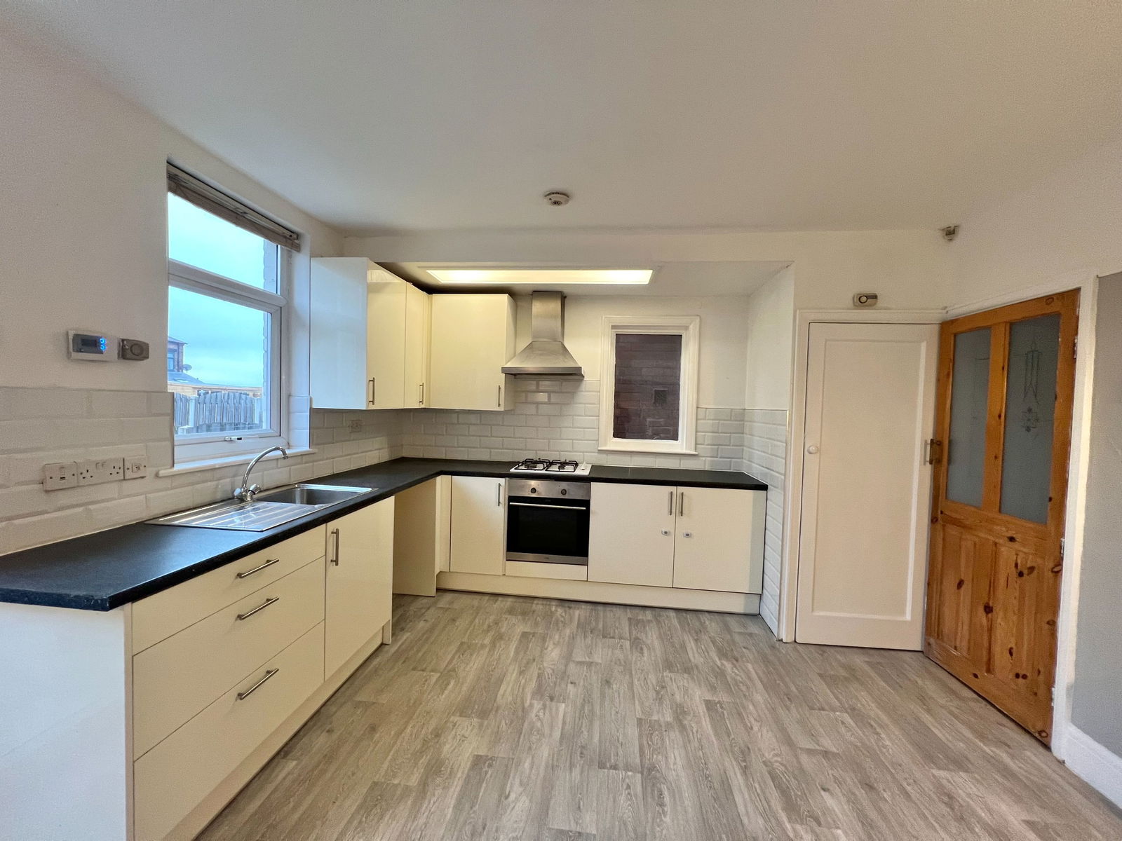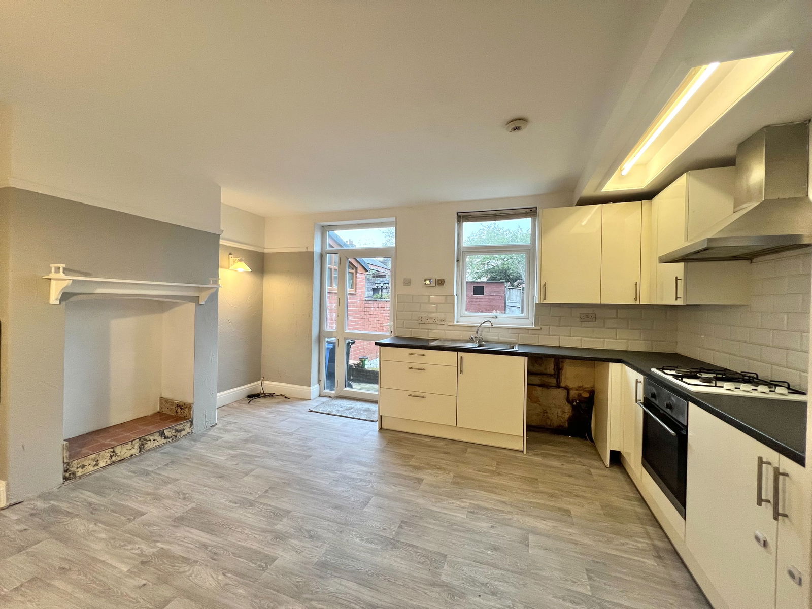 A well proportioned room presented to the rear elevation featuring a modern fitted kitchen comprising wall and base units with roll edge work surface incorporating sink unit. There is a four ringed gas hob, extractor fan and integral oven, plumbing for an automatic washing machine and space for a freestanding fridge freezer. There is part tiling to walls, fully tiled floor, a large dining space and focal point chimney breast. There are two double glazed windows, UPVC double glazed door onto rear elevation and a pantry style cupboard housing the gas and electric meters, which provides storage.