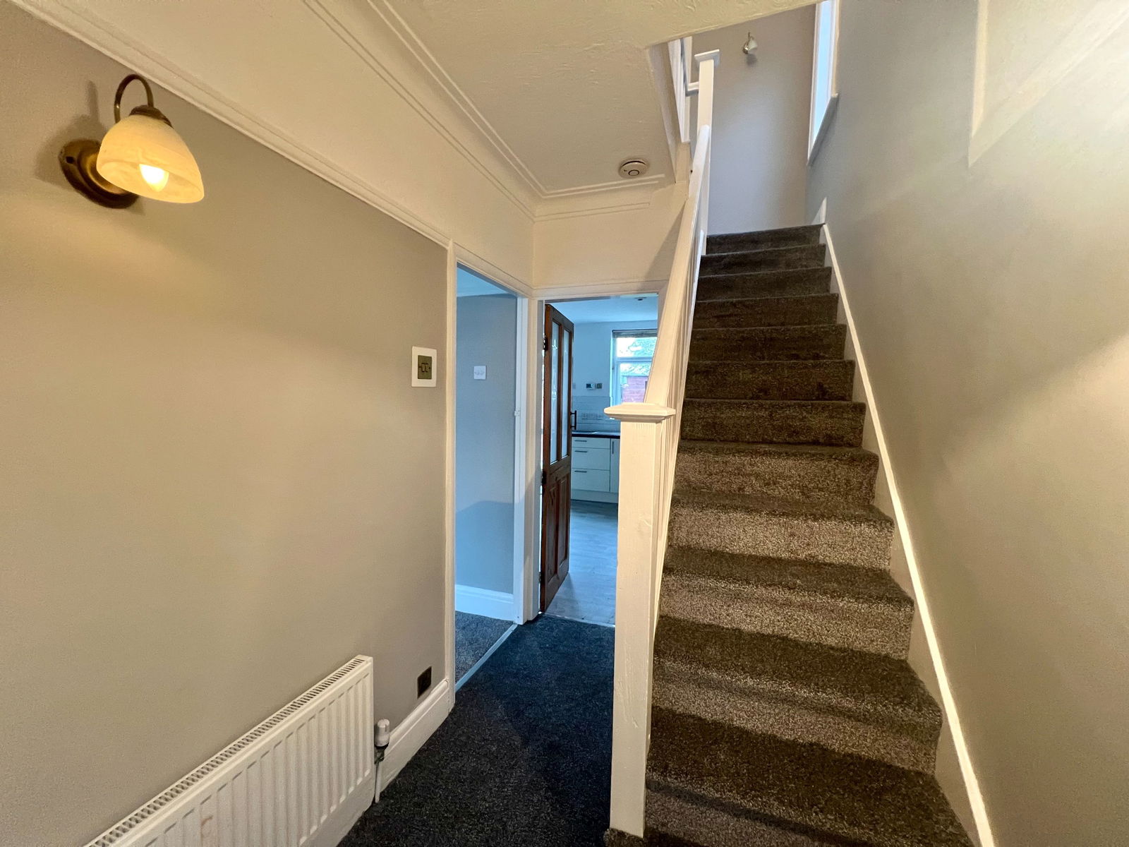 Having spindle balustrade staircase rising to the first floor. There is laminate finish to the floor and a radiator. Access is provided to the lounge and dining kitchen.