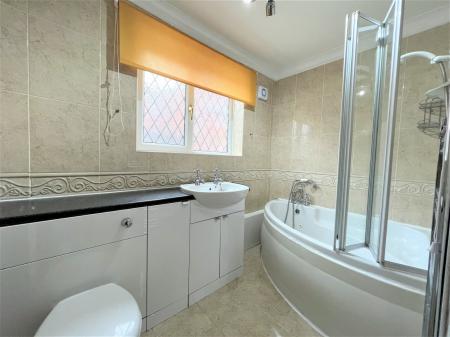 Located to the rear of the property and presented with a three piece suite finished in white, comprising a corner bath with a shower over with a folding screen, a wash hand basin and low flush W.C which are set into a vanity unit, with useful storage cupboards. There is full tiling to the walls and floor, a spot light to the ceiling, an extraction unit, an Opaque double glazed window and a chrome towel radiator.