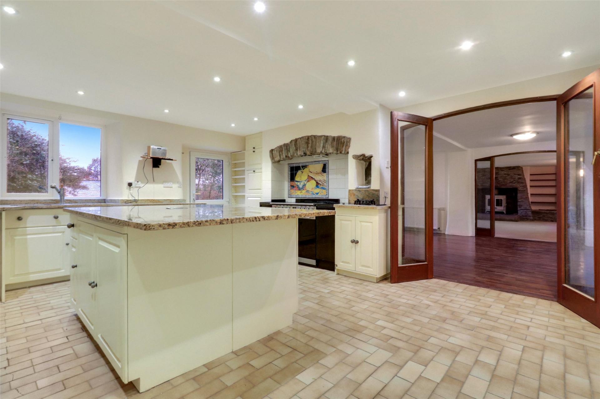 Kitchen Dining Room Fitted with a range of cream fronted high and low level units, single drainer sink unit set into work surface, Smeg electric range cooker set into a stone framed recess with extractor hood above, recess and plumbing for dishwasher, radiator, tiled flooring, double glazed window and door to rear. Double doors to: