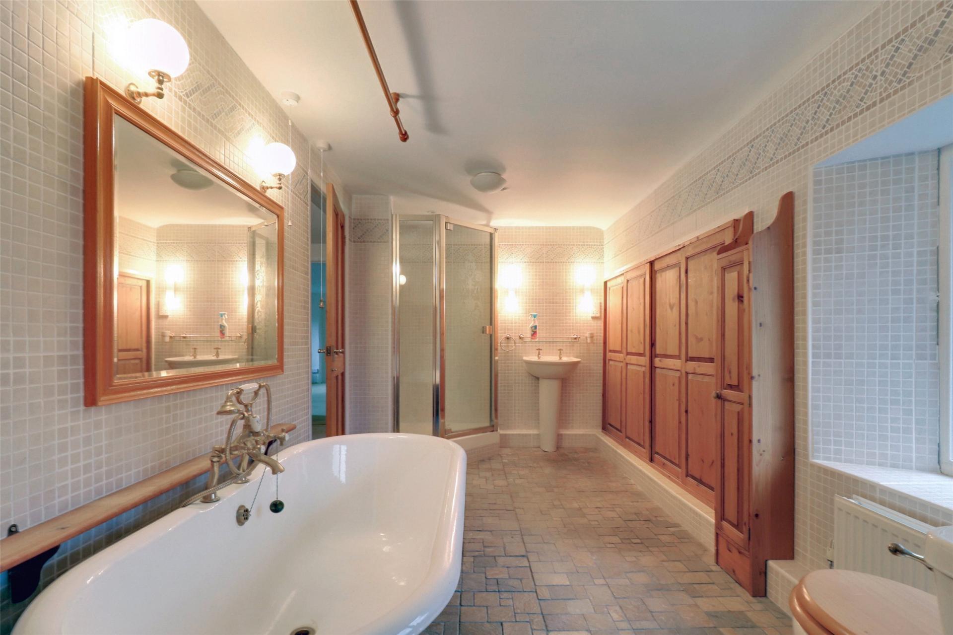 Bathroom White suite comprising of roll top bath, corner shower cubicle, low level wc, pedestal wash hand basin, tiled walls and flooring, wall lights, built-in airing cupboard housing the oil fired boiler and hot water cylinder and slatted shelving to side. Door to Bedroom 3.