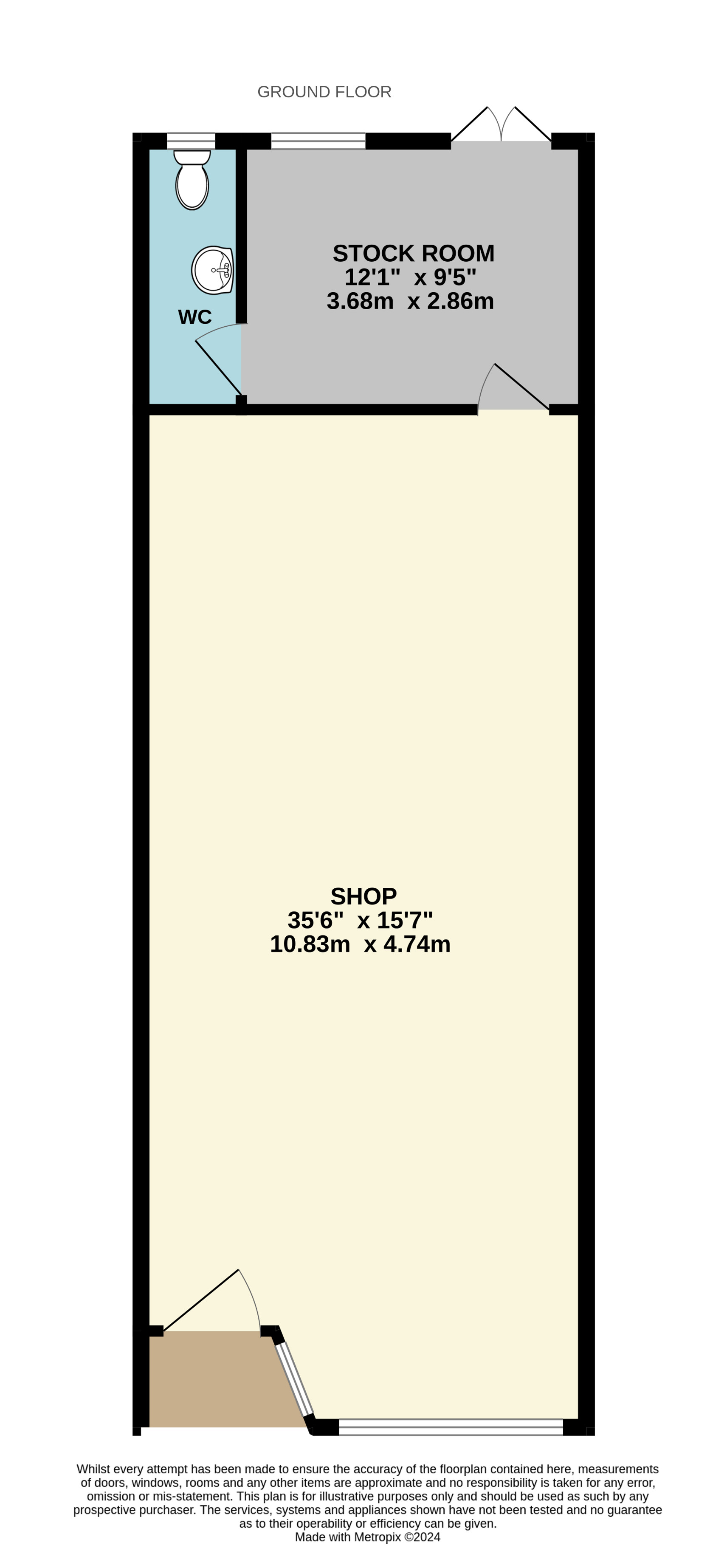 Shop 35'6" x 15'7" (10.82m x 4.75m).