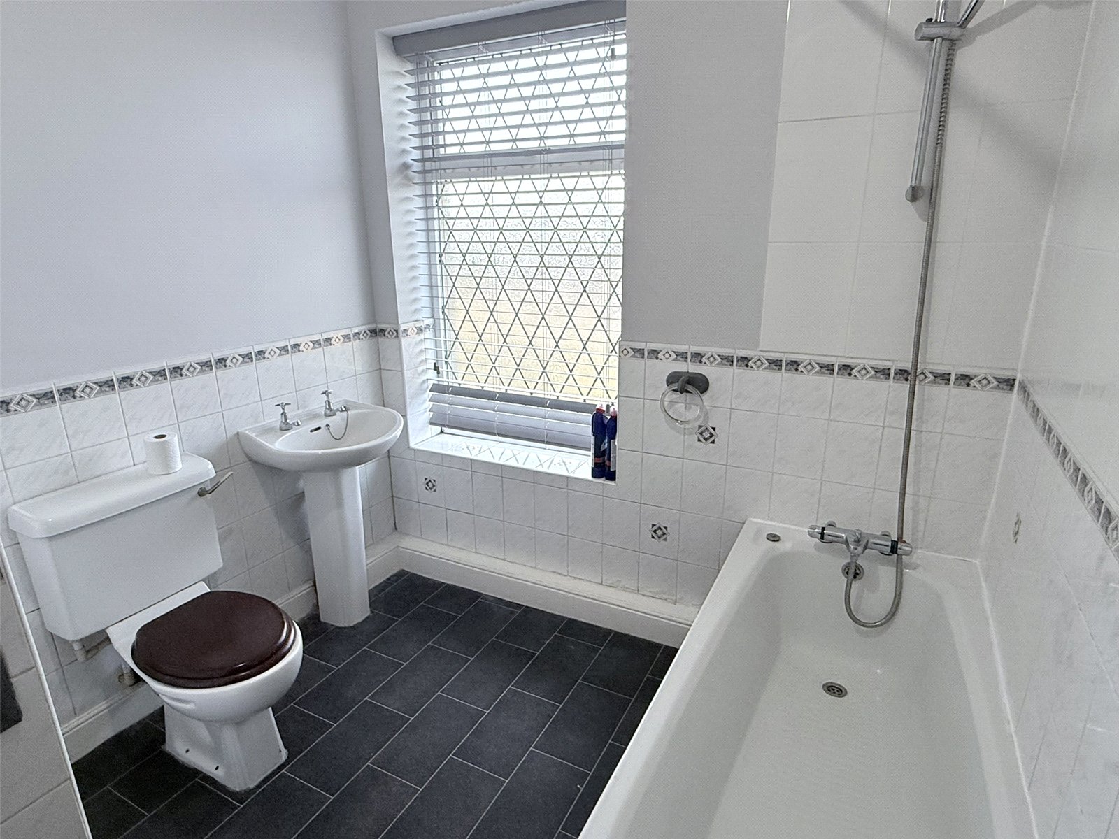 Bathroom With store cupboard over bulkhead housing central heating boiler, fitted with a white suite comprising; panelled bath with mixer tap and shower attachment, pedestal wash hand basin, low flush wc, part tiled walls, upvc window, radiator.