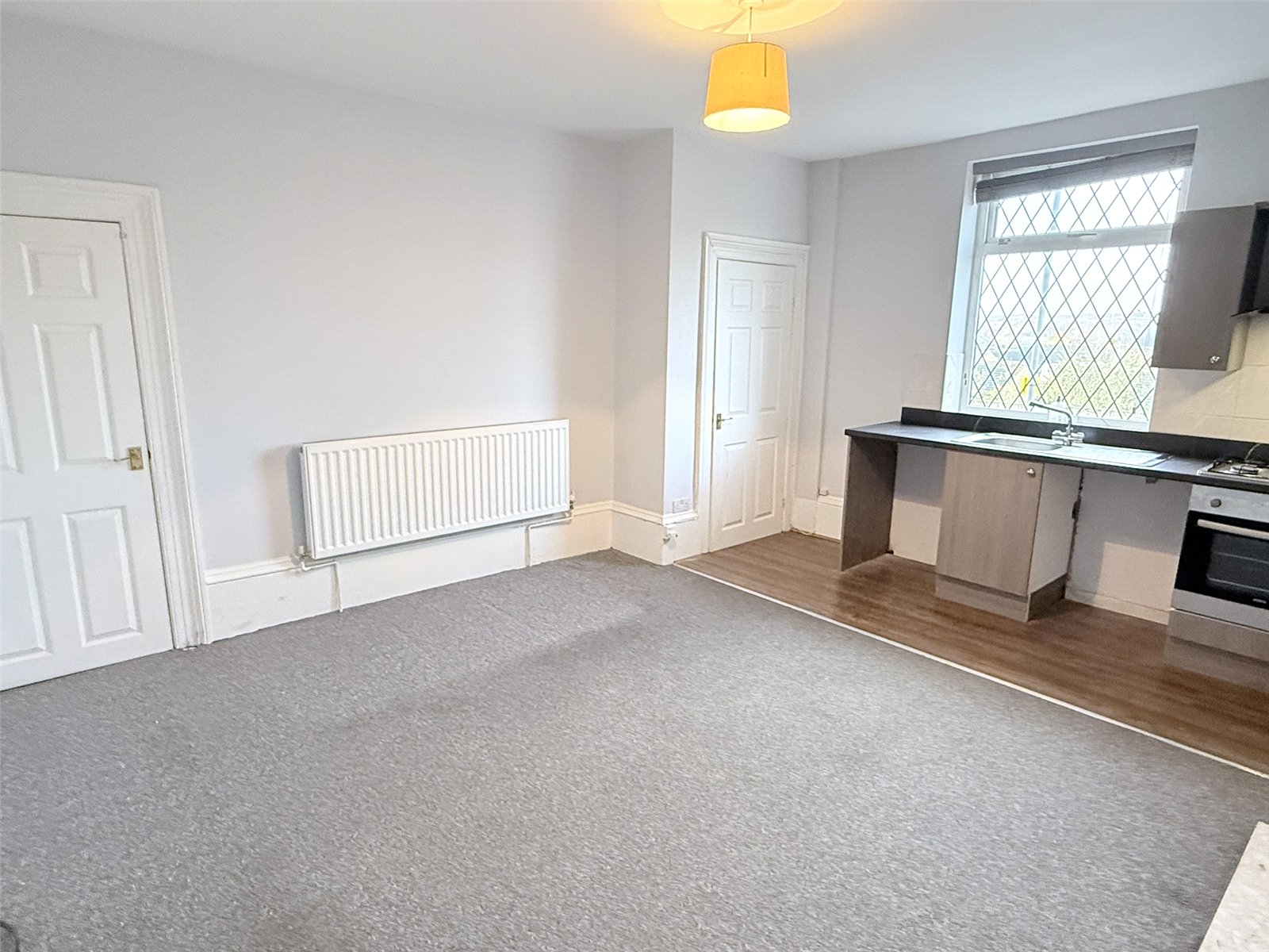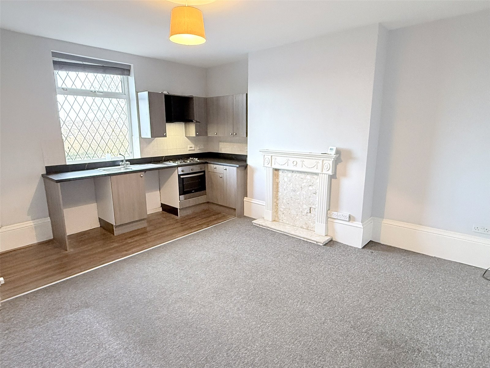 Living Room/ Kitchen 15'11" x 13'11" (4.85m x 4.24m). A complete living area with kitchen area fitted with a range of wall and base wood fronted units with work surface and a tiled splashback, inset sink unit with mixer tap and drainer, inset stainless steel gas hob with hood over and oven under, space for washing machine, Upvc window and laminate floor. Lounge/dining area with ornate fireplace, radiator and door leading down to cellar, with Upvc window at cellar head.
