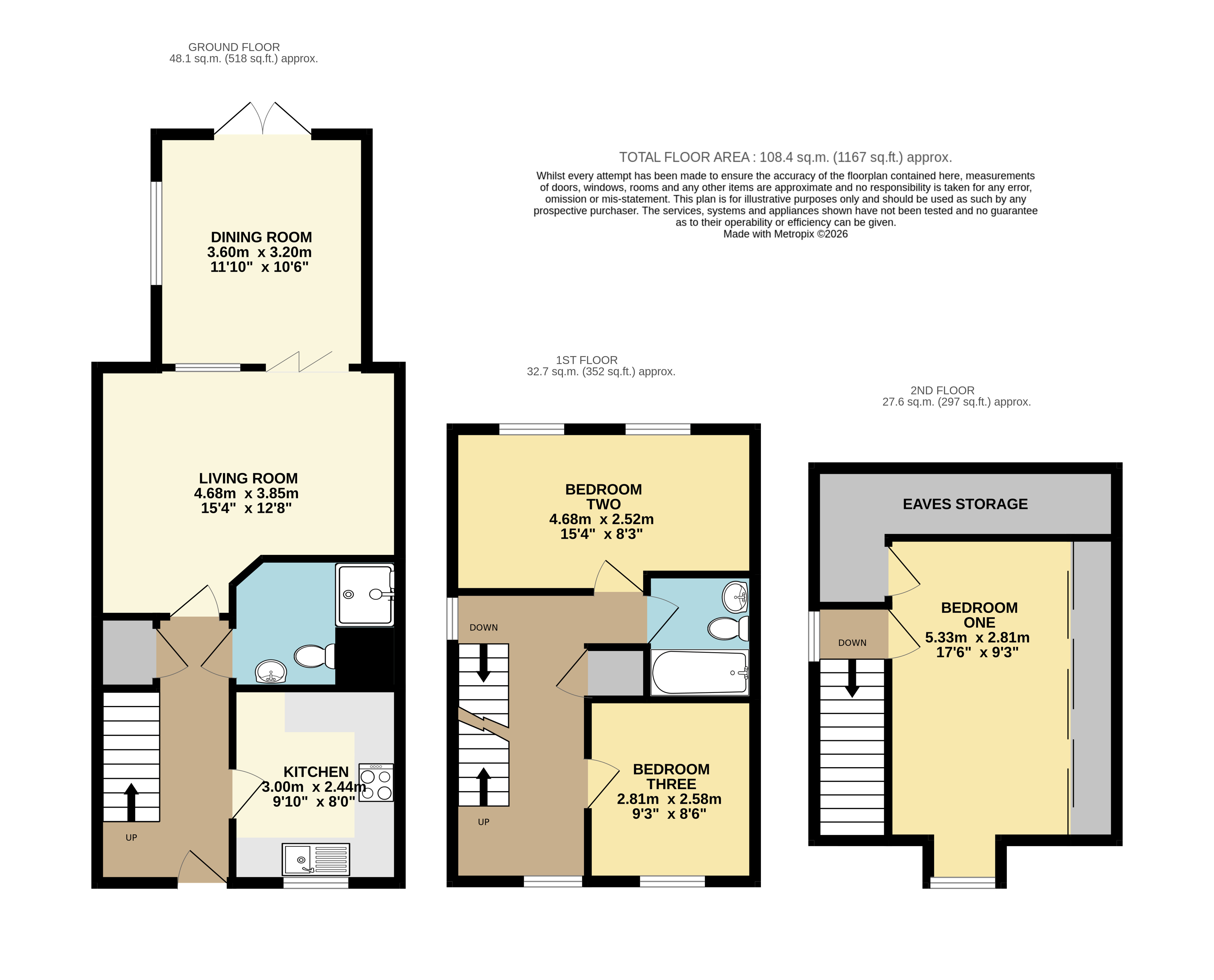 On the first floor are two well-proportioned bedrooms along with a family bathroom. The top floor is dedicated to a generous master bedroom, benefiting from built-in wardrobes and offering a peaceful retreat.