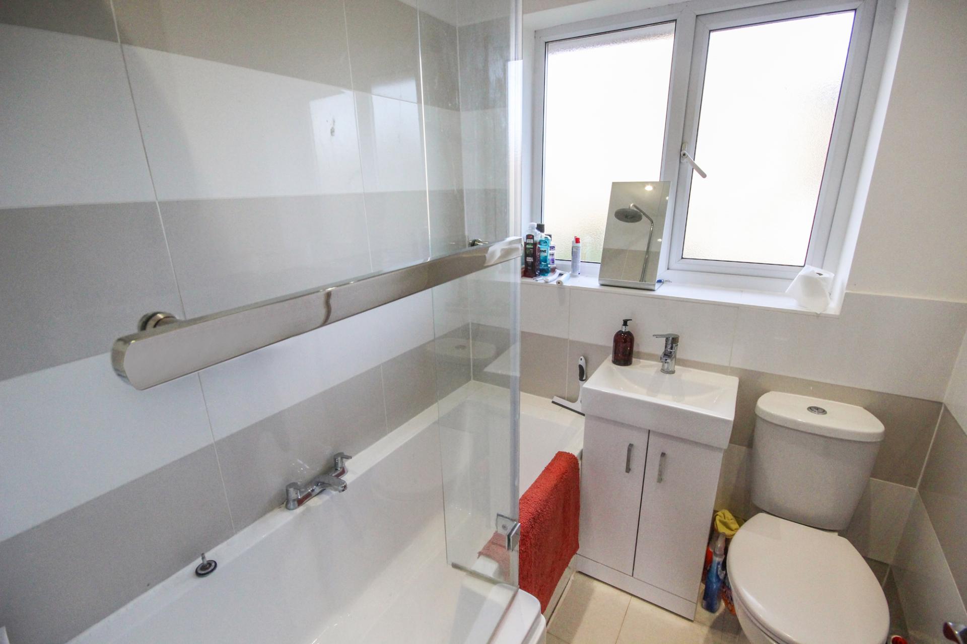 Moving upstairs the first floor consists of two good size bedrooms, the master of which has the convenience of a double built in wardrobe, whilst the bathroom is fitted in a stylish white three piece suite comprising P-shaped bath with glass screen over, low level wc and wash hand basin set into a vanity unit. Modern tiled floor and splashbacks add a further contemporary edge.