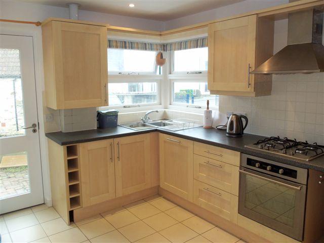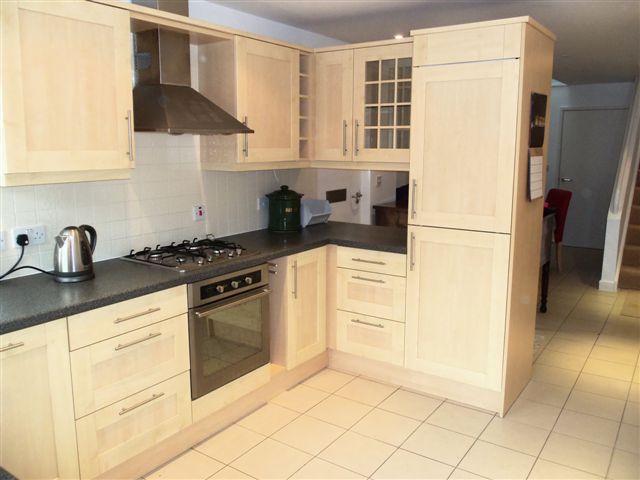 3.66m (max) (12’) x 2.81m (9’02”) Double glazed windows overlooking the front aspect. Door to the front of the property. A modern attractively fitted kitchen which comprises of a range of floor standing and wall mounted cupboards with beech coloured door and drawer fronts and stainless steel handles, co-ordinated worksurfaces and cream tiled splashbacks. L’ shaped stainless steel corner sink with a single drainer. Stainless steel four burner gas hob with stainless steel extractor over and built in stainless steel electric oven with grill. Integrated ‘tower style’ fridge/freezer. Ceramic tiled floor. Inset spotlights. Thermostatically controlled radiator. Concealed gas fired Vailliant boiler for central heating and hot water. Pair of matching roller blinds to the kitchen windows and matching curtain to the door.