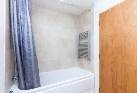 • Luxury Bathroom with white 3 piece suite including shower over bath, sink & pedestal, WC & Chrome heated towel rail, with modern day wall & floor tiling