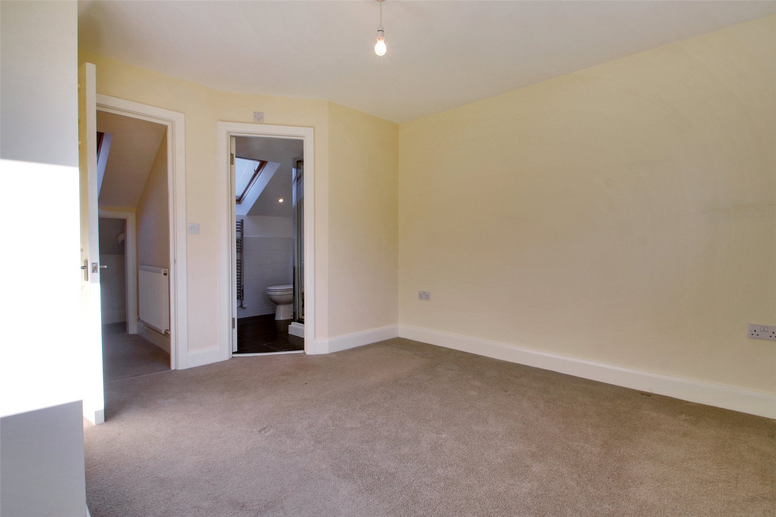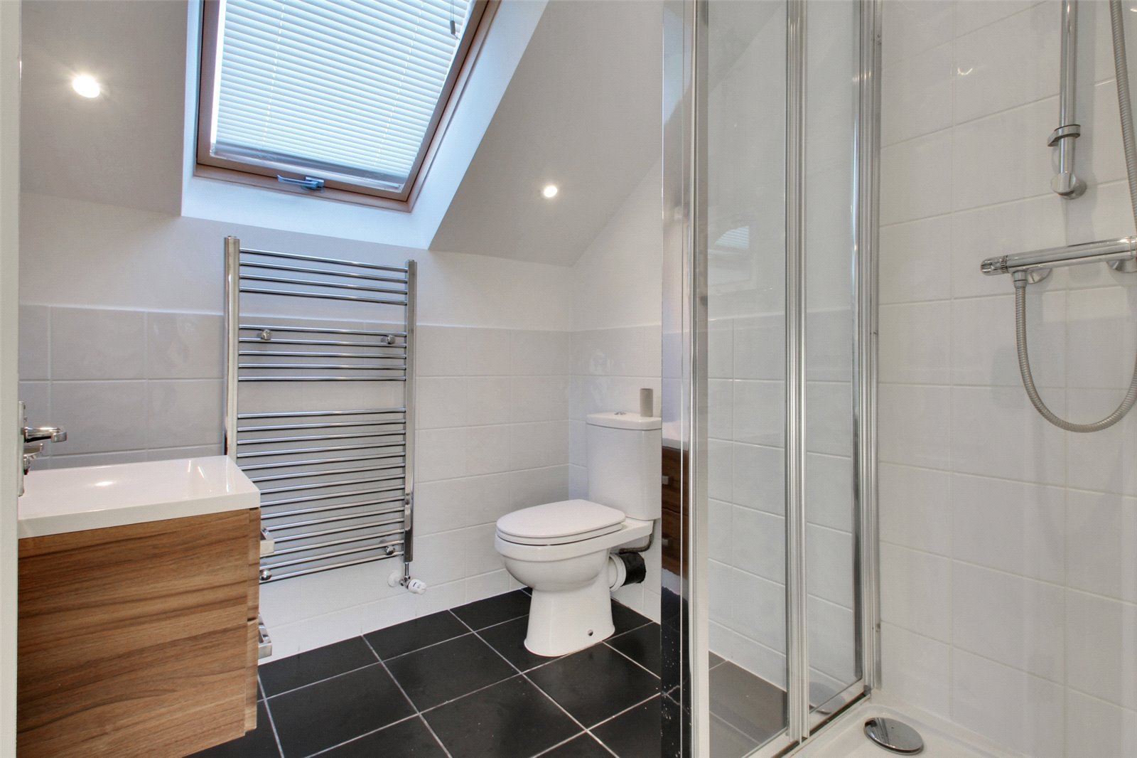 En-Suite Shower Room 6'11" (2.1m) at widest point x 6'1" (1.85m). Fakro skylight window to front. Tiled flooring. Plain ceiling with downlights. Chrome heated towel rail. Square shower cubicle with folding door. Low level W.C. Floating sink unit with drawer unit below. Light with shaver point.