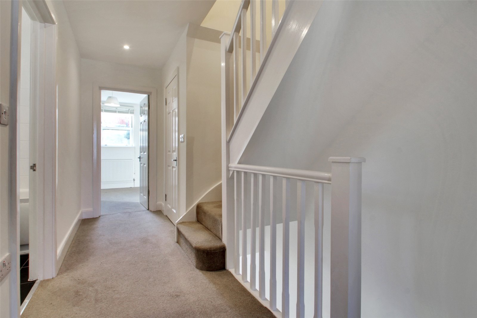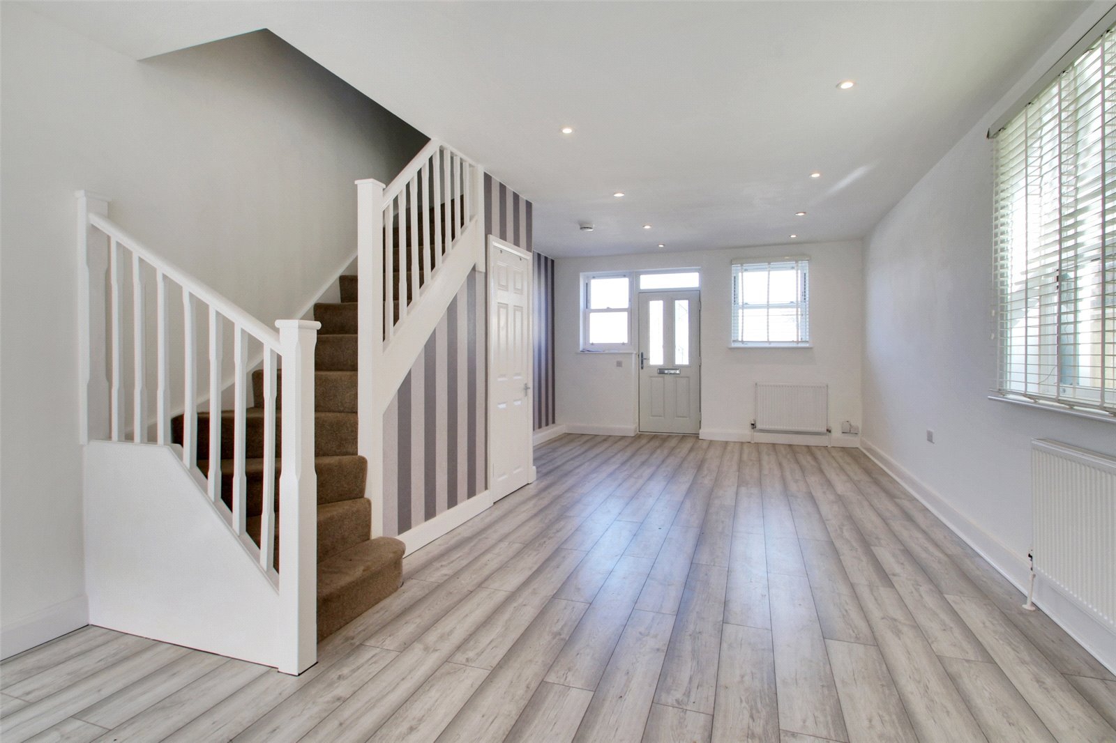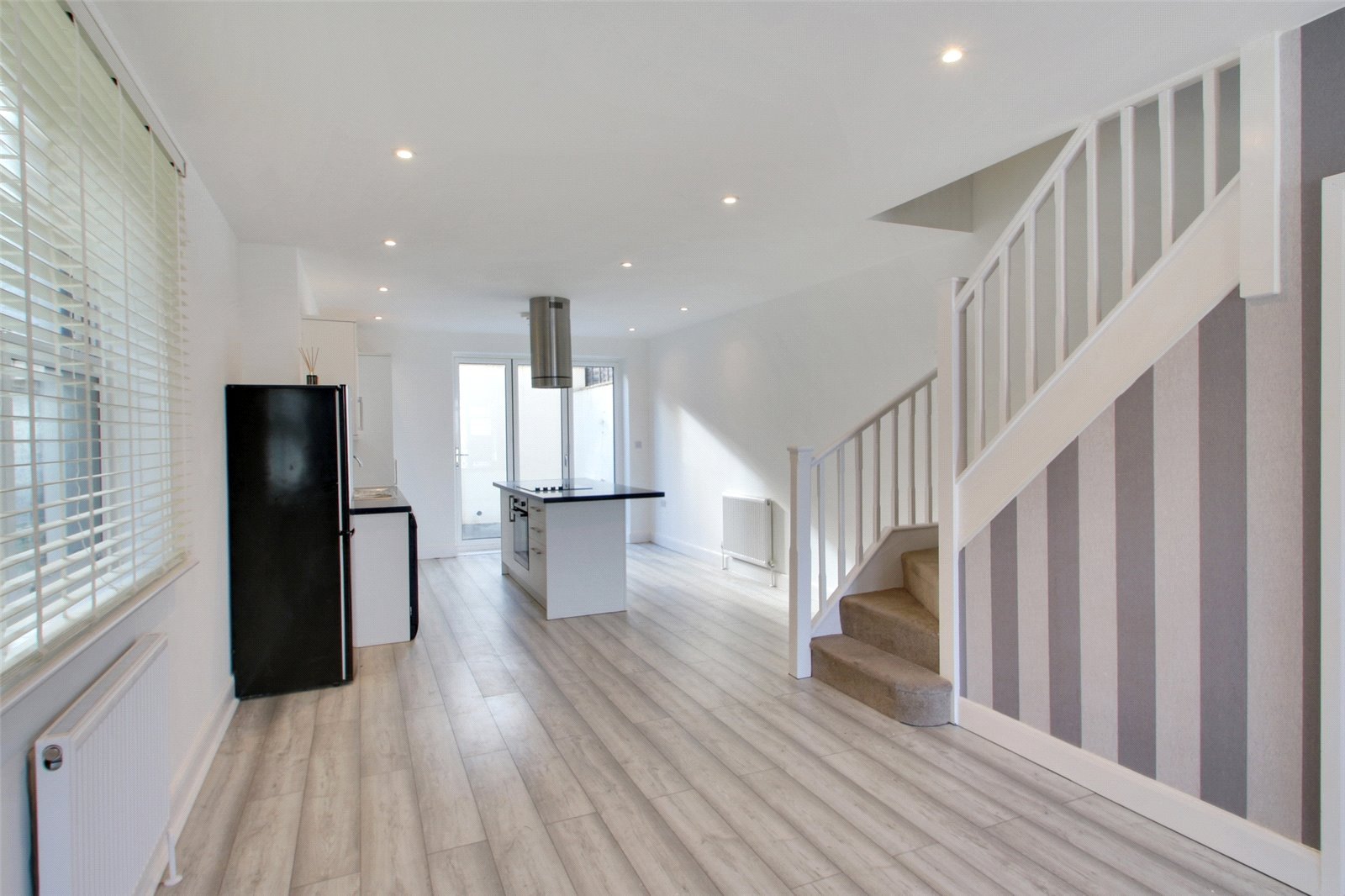 Sitting/Dining Room Area 24'5" (7.44m) x 12'10" (3.9m) narrowing to 10'2" (3.1m). Double glazed panelled door to front with leaded light effect glass window above. Double glazed window to front. Double glazed frosted sash window to front. Laminate flooring. Plain ceiling with downlights. Two radiators. Stairs leading to first floor landing. Understairs storage cupboard housing fuse board. Open plan to kitchen area.