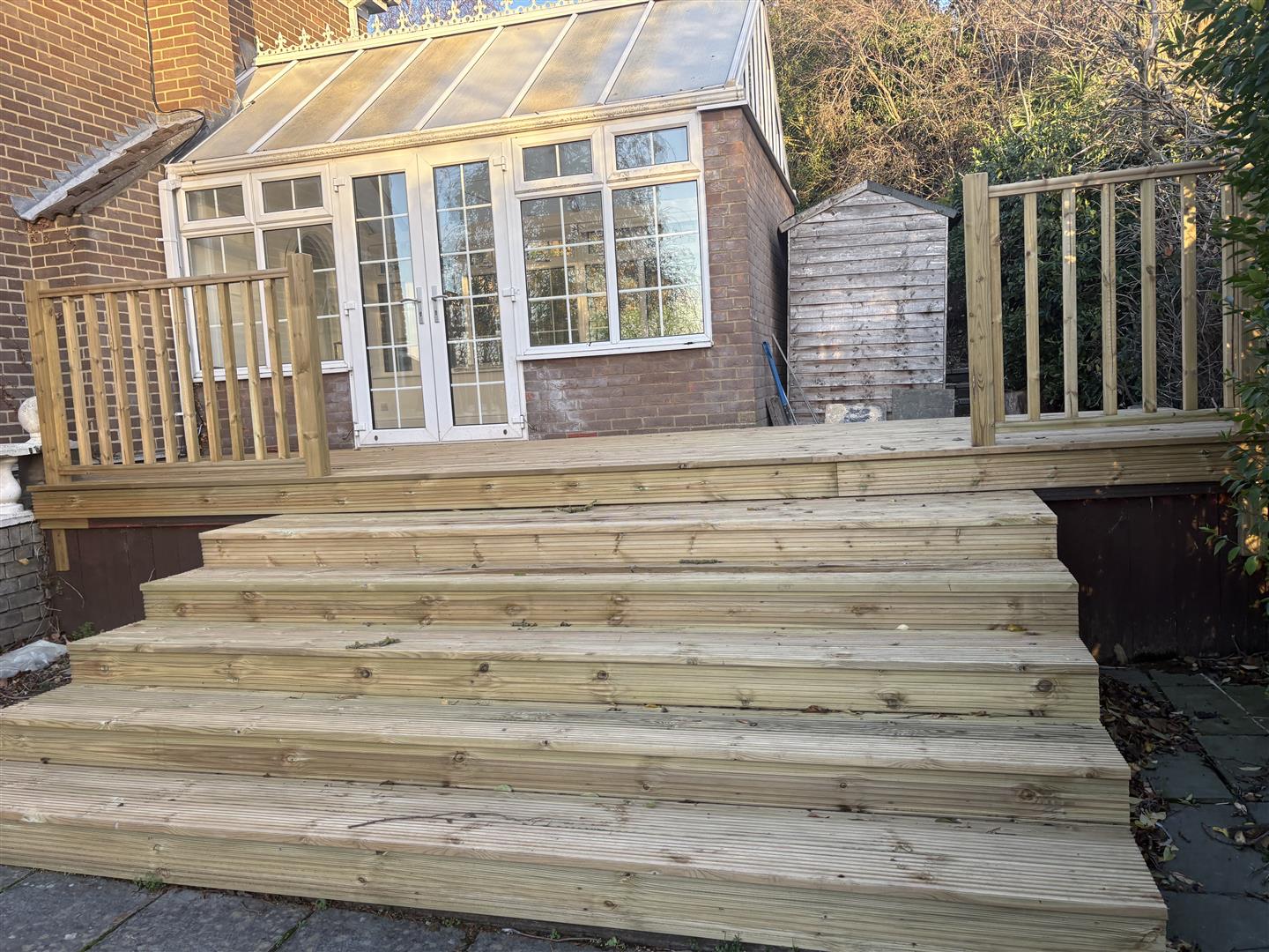The rear garden is separated into several areas including a sizable patio, garden that is laid to lawn, an elevated decked section - recently replaced, to the rear to capture the sun and surrounding scenery. Side decked area newly replaced. Parking for several cars
