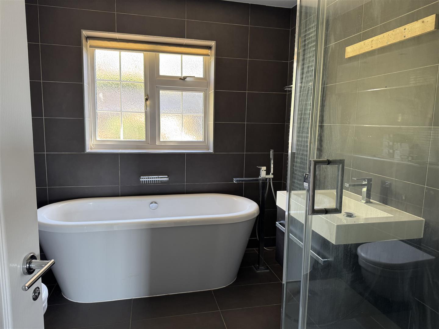 The wooden stairway leads to a beautiful, part galleried landing with large window overlooking the front of the property commanding views towards the downs. Four double bedrooms two of which have fitted, contemporary style, sliding wardrobes. The master bedroom has a modern en-suite with oversize shower. Main bathroom has a white ceramic roll top bath, wall hung WC and separate shower.