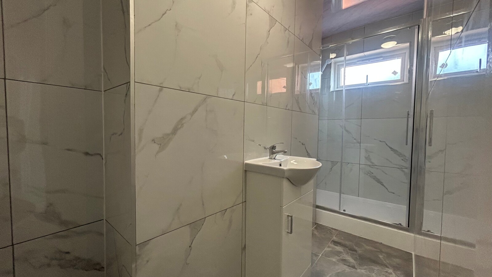 Hallway with access to spacious living room and open plan kitchen. Family bathroom and double bedroom.