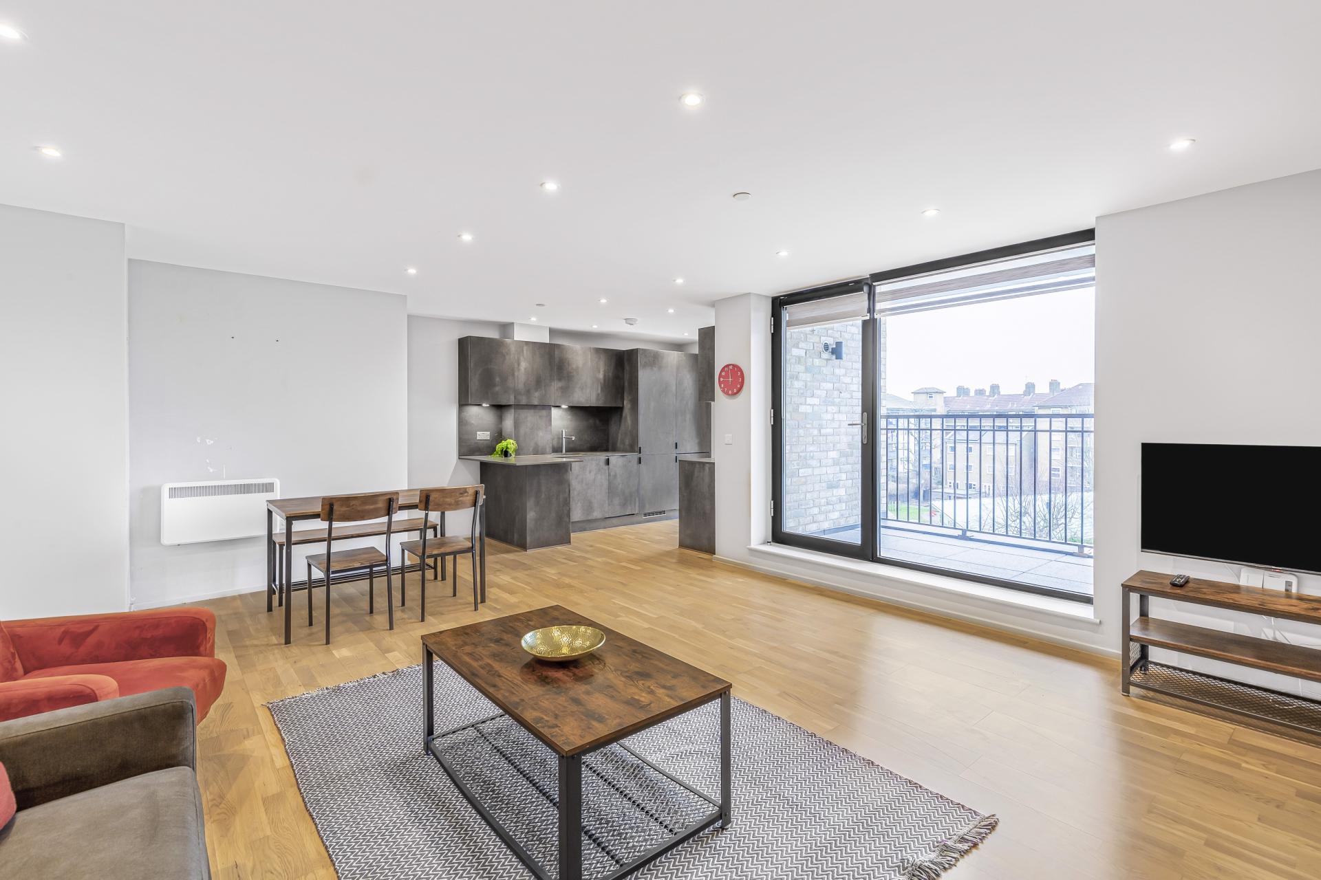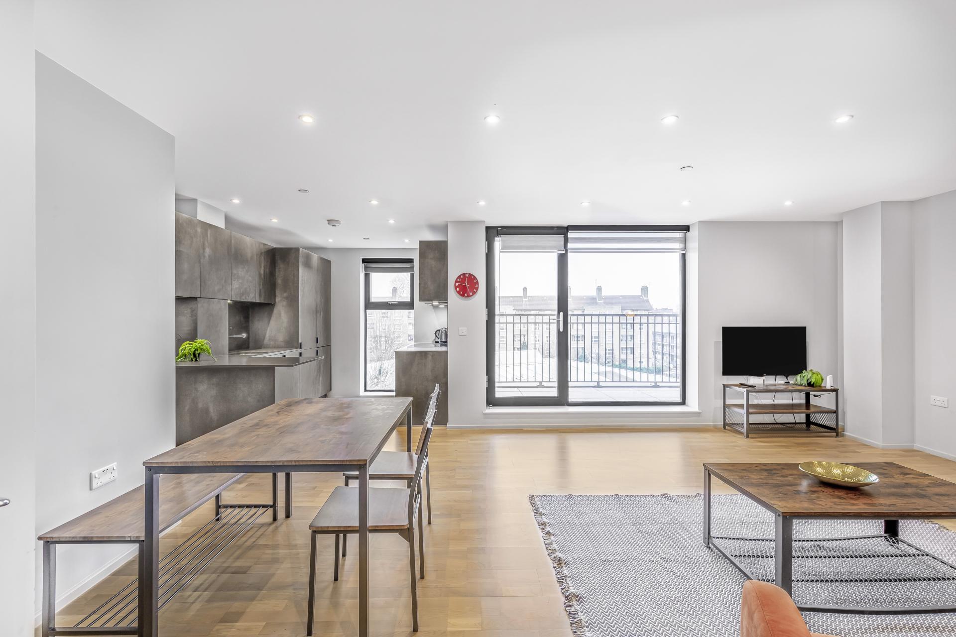 private balcony. Expansive open plan reception/kitchen with full height window