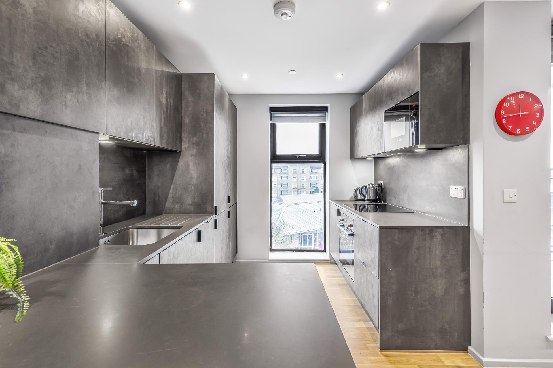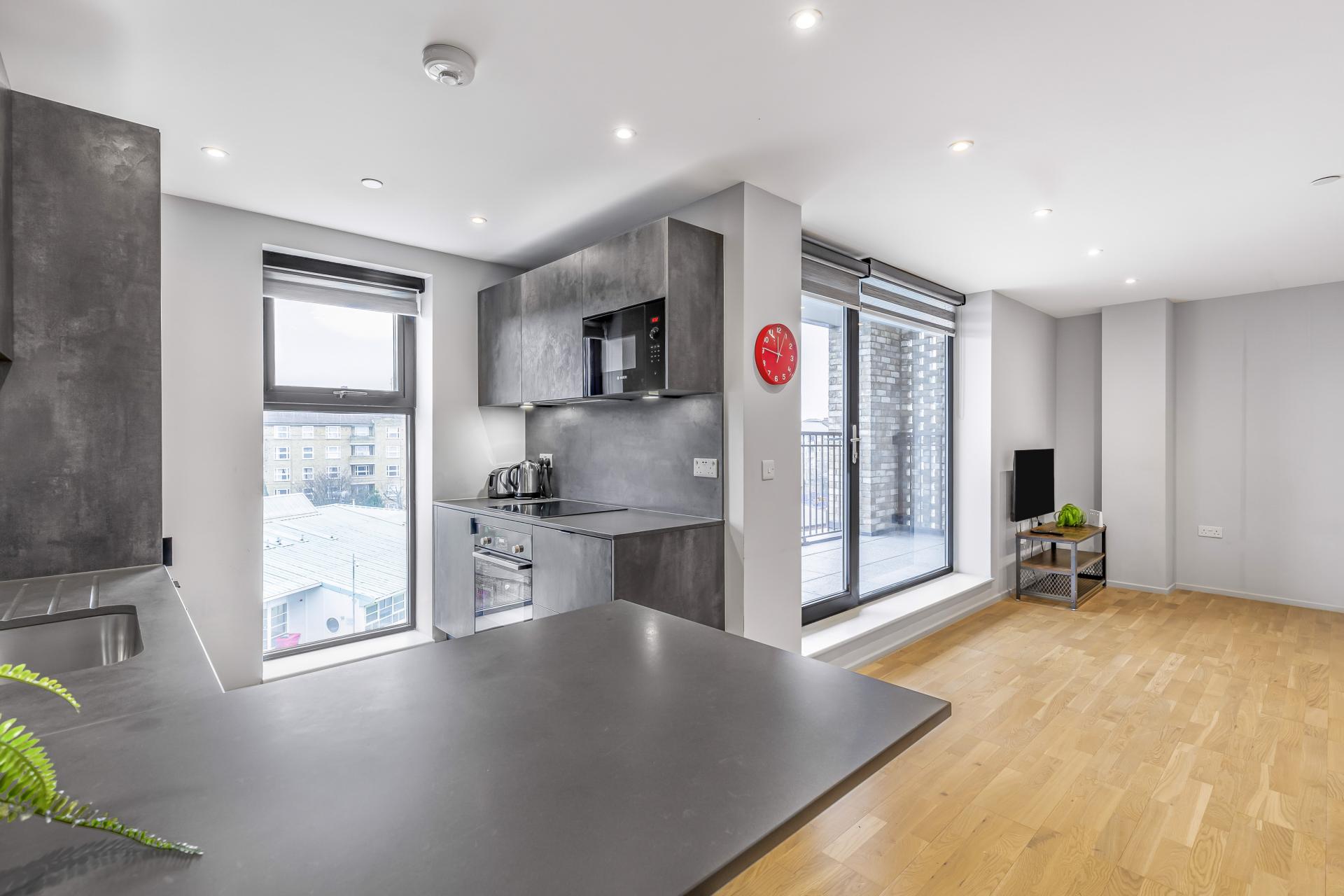and direct access to the balcony. Contemporary kitchen with fully integrated