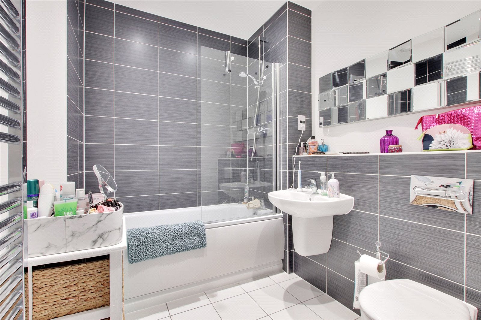 Bathroom 7'4" x 6'5" (2.24m x 1.96m). Tiled flooring. Plain ceiling with downlights. Heated towel rail. Shaver point. Part tiled walls. Panelled bath with shower over. Wash hand basin. Low level W.C.