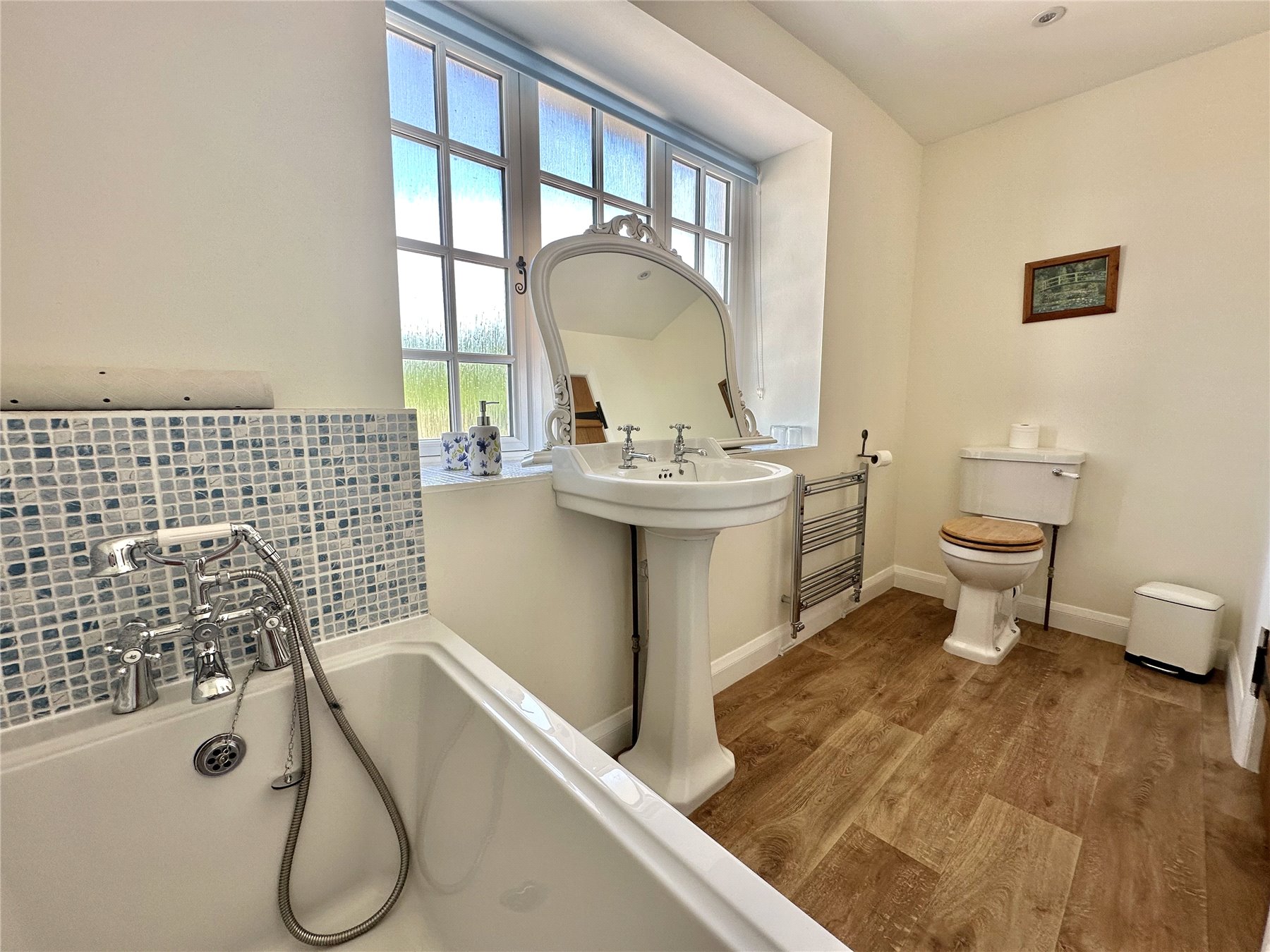 ENSUITE BATHROOM A modern fitted suite with low level WC, heated towel rail, white basin sink and bath with shower over. Frosted double glazed windows.