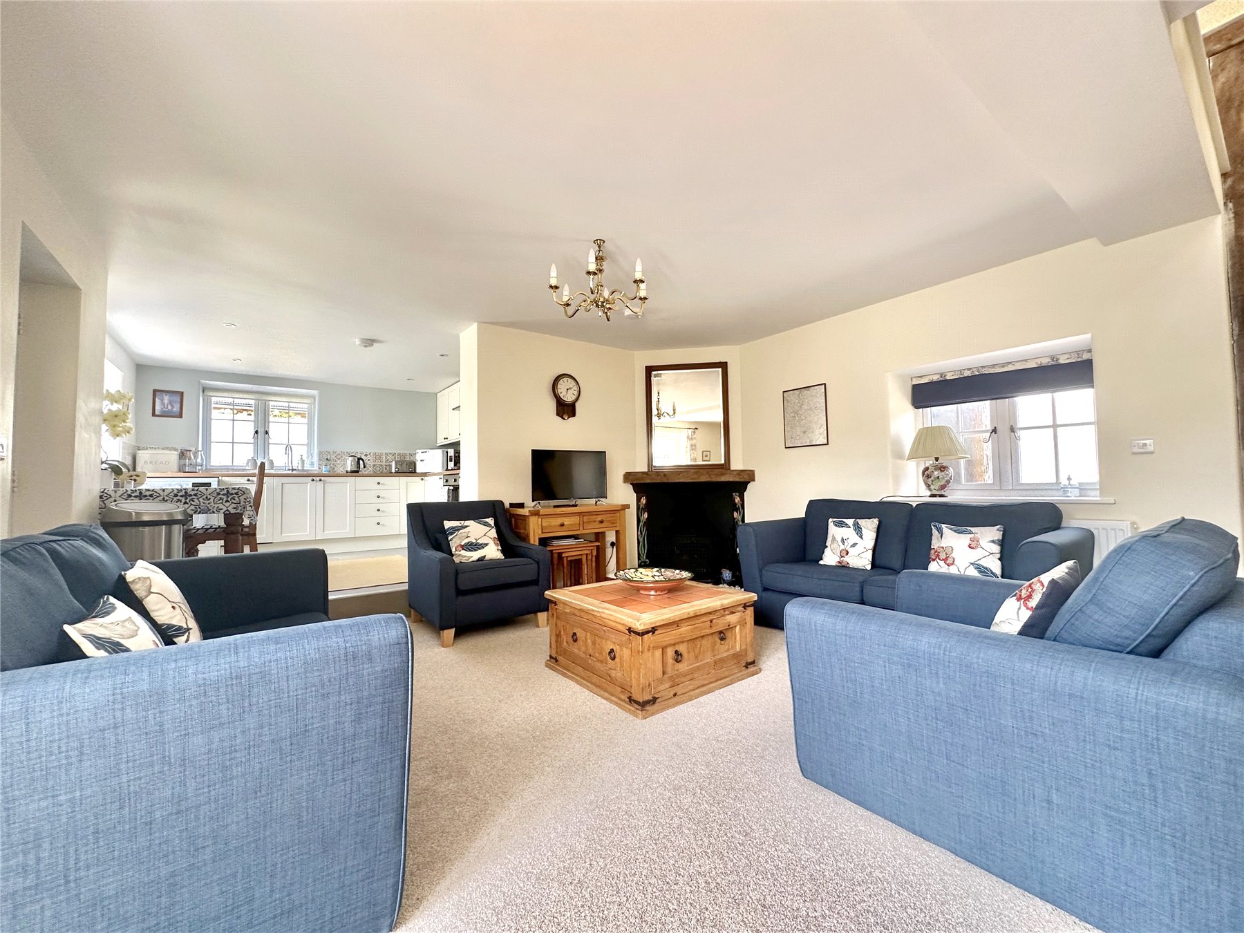 LIVING/DINING ROOM 22'8" x 15'1" (6.9m x 4.6m). Comprising of double glazed French doors out to the garden/patio. Dual aspect windows to front and side. Integrated shelving, radiator and under stairs store cupboard, woodburning stove with wooden mantle. Flowing nicely into the-
