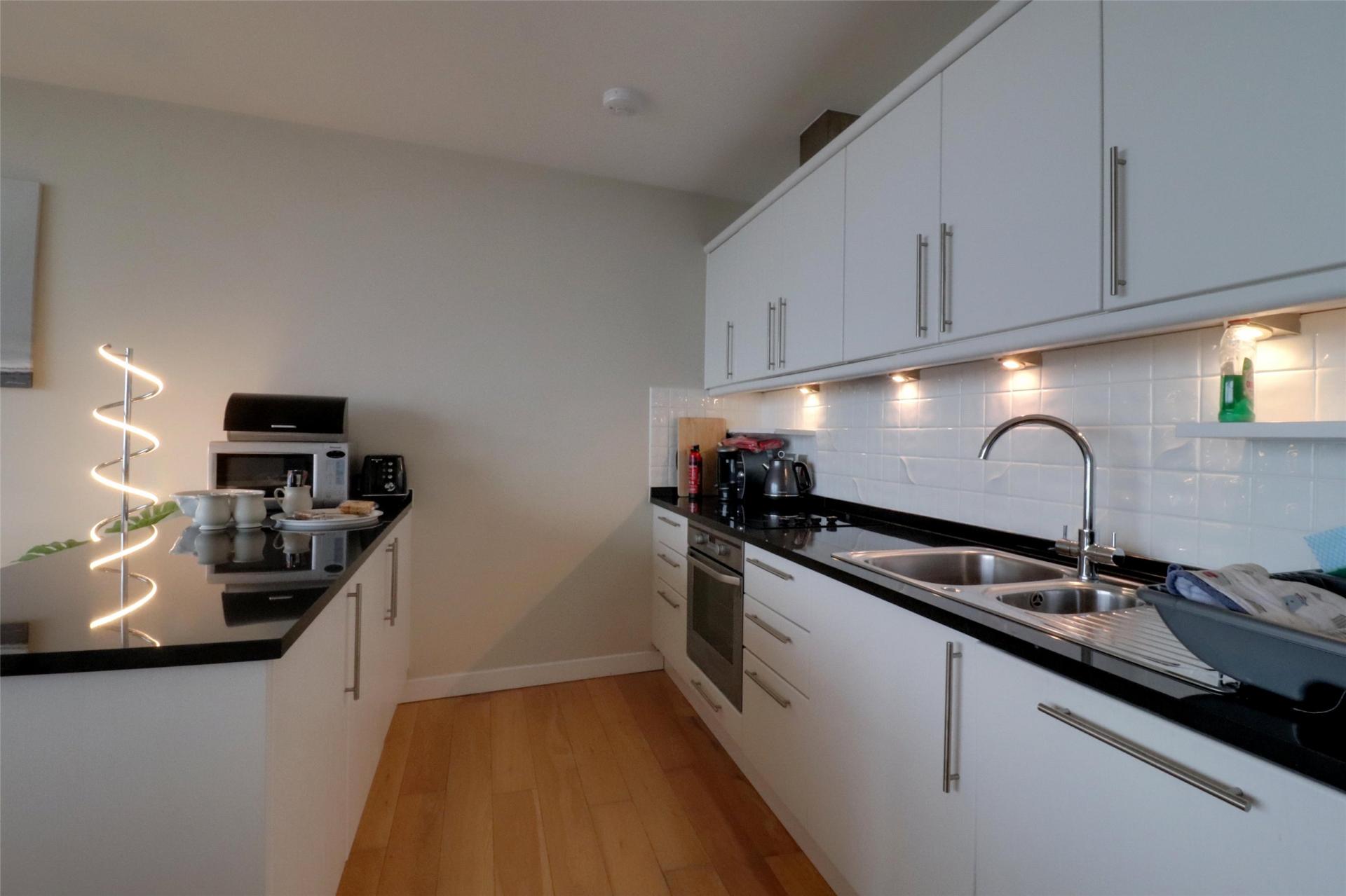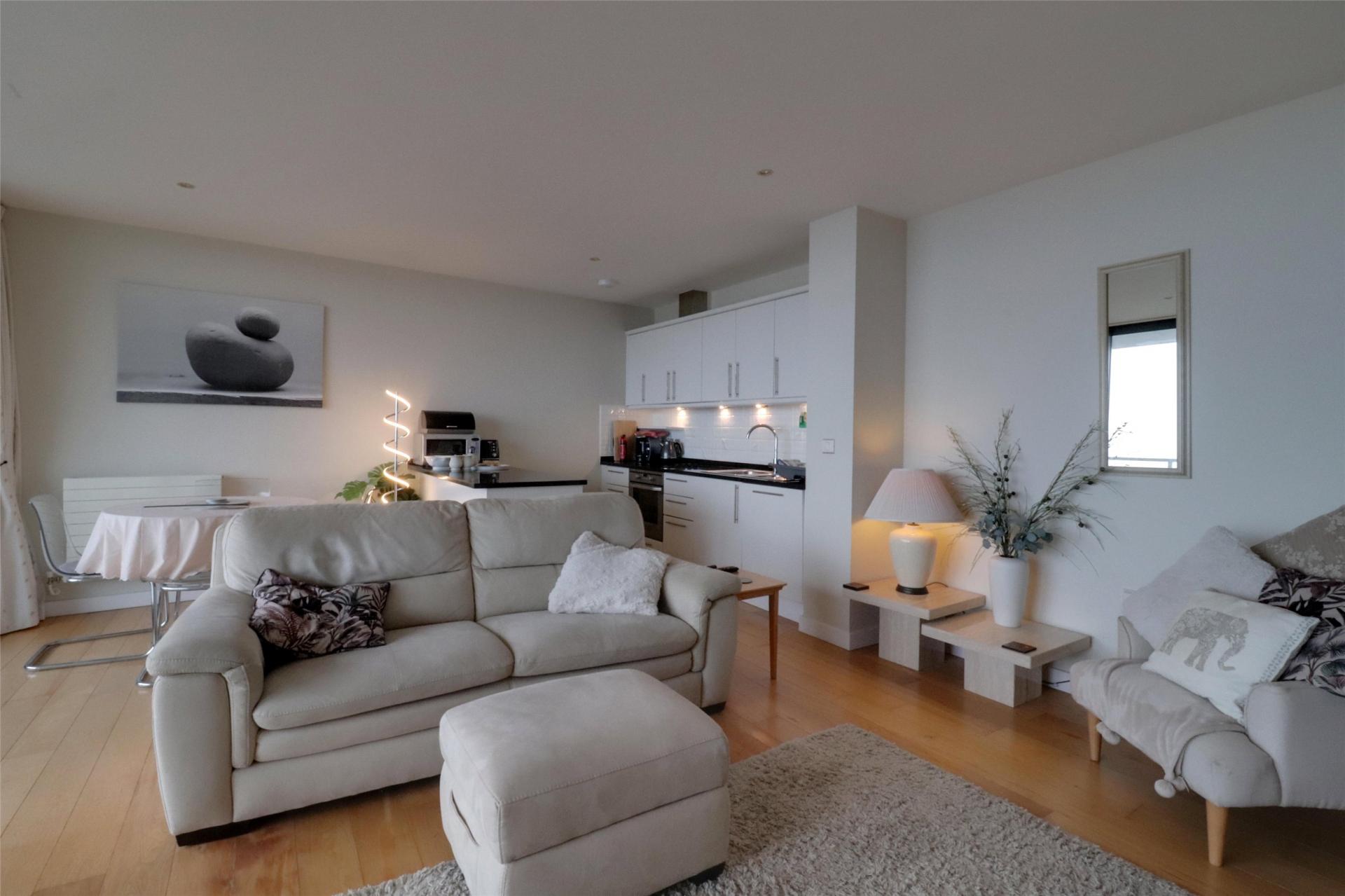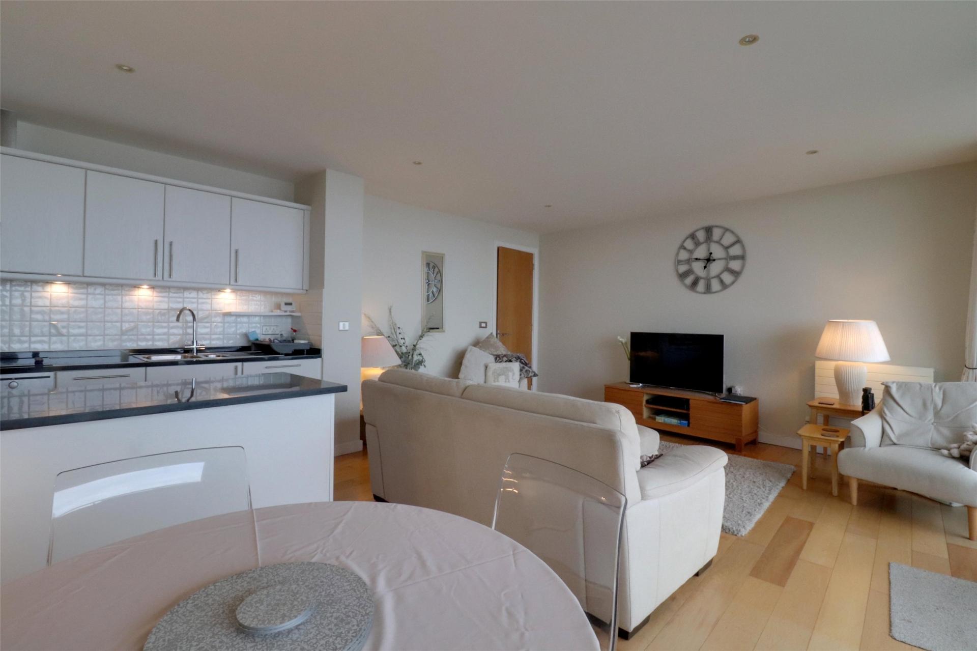 The open-plan living space is a real highlight, with floor-to-ceiling sliding glass doors opening out to a full-width balcony, offering superb views and plenty of natural light. The modern kitchen/dining area also enjoys access to the balcony and features granite worktops and a full range of integrated appliances.
