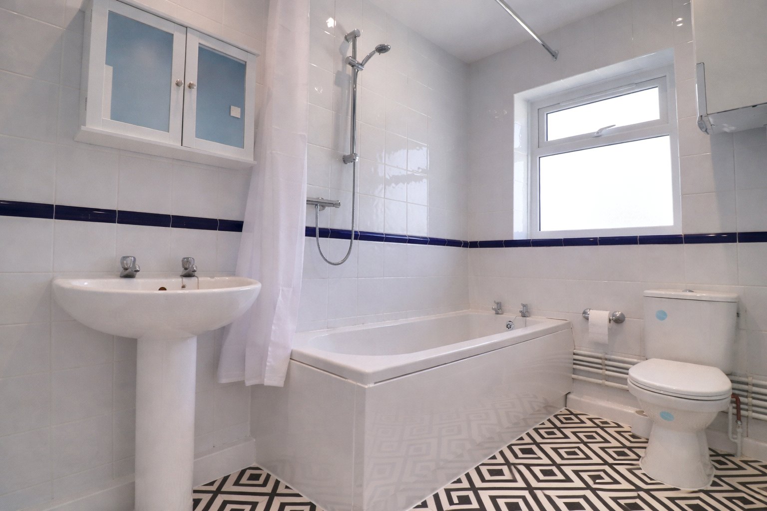 The family bathroom offers a contemporary white suite with a bath and shower over.