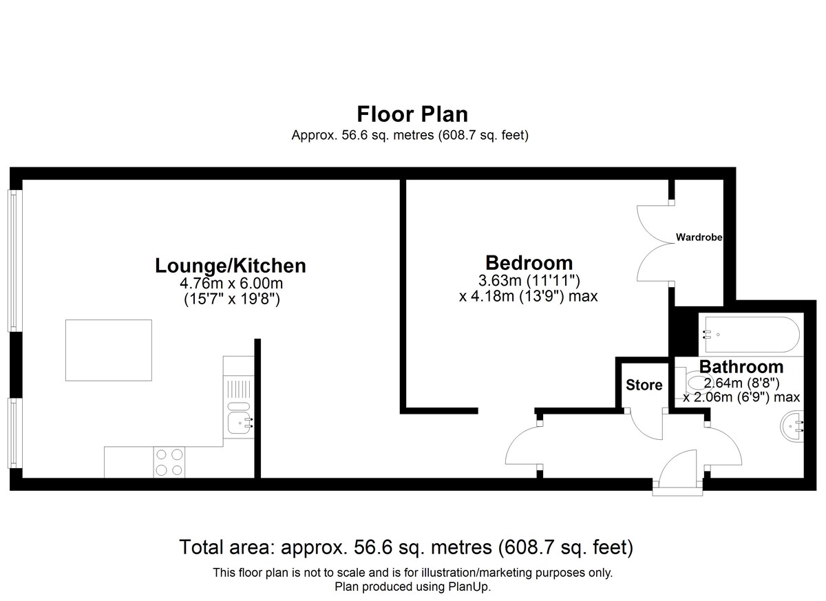 Accommodation includes open plan living area with large windows, an internal bedroom with fitted wardrobes, a fully fitted kitchen area and a bathroom with bath & shower. Hallway with airing cupboard and space for coat hanging.