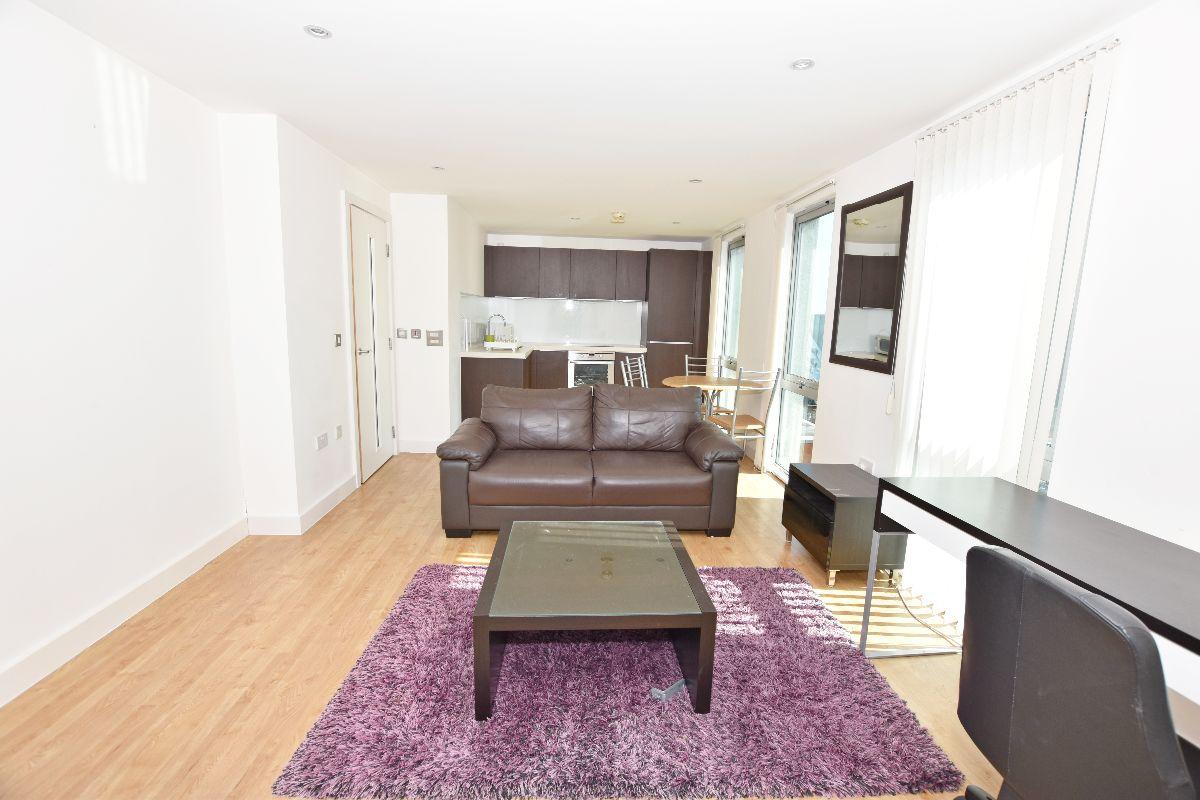 This apartment consists of one spacious master bedroom, A bright open-plan living room area features a large sofa, dining table, and additional furniture. A fully integrated kitchen includes a fridge/freezer and a washer/dryer. The development also benefits from fantastic views, plenty of natural light with floor-to-ceiling windows, and ample internal storage space.