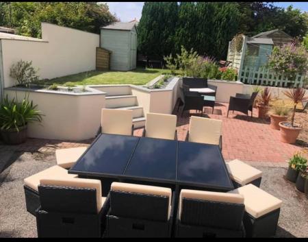 To the front of the property is a courtyard style garden. To the rear, the garden features a patio and lawned area.