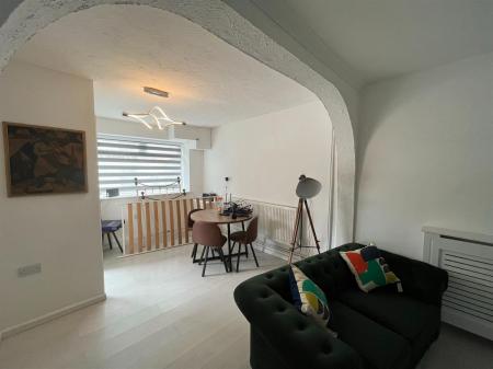 Grey wooden flooring, one radiator, feature fireplace housing fire, alcoves with storage, under stairs storage, window to side of property, open plan dining room.