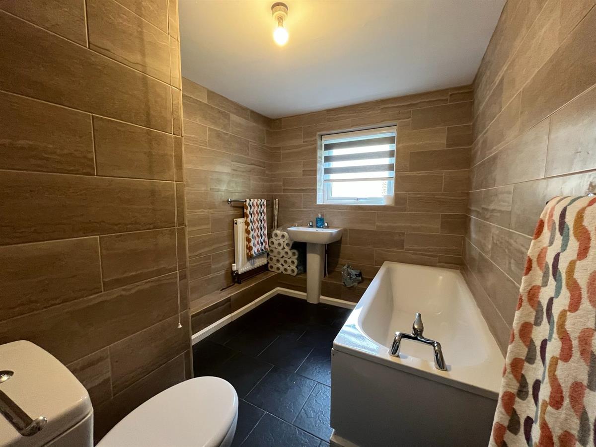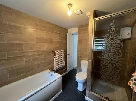 White suite comprising of w/c, hand basin, shower cubicle with electric mixer shower, tiled flooring, one radiator, tiled walls, extractor fan, window to back of property.