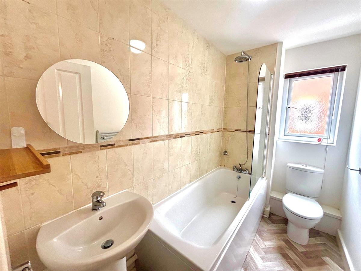 Family bathroom with a UPVC double glazed window to front aspect, three piece suite comprising low level wc, pedestal wash hand basin, bath with shower over , side glass screen and with tile walls, towel radiator, plain and tile splash back walls, plain ceiling and vinyl flooring.