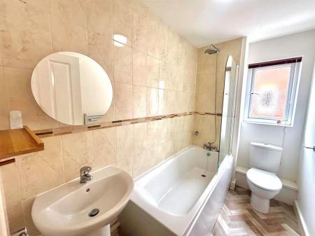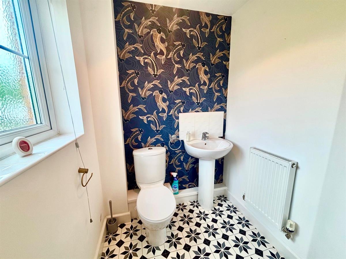 UPVC double glazed window to front aspect, two piece suite comprising low level wc, pedestal wash hand basin, radiator, plain and feature paper walls, plain ceiling and vinyl flooring.