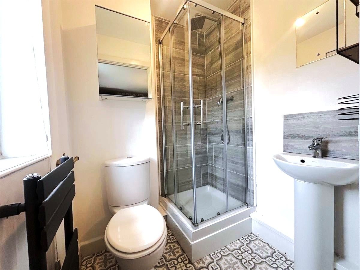 Newly fitted en suite with a UPVC double glazed window to front aspect, three piece suite comprising low level wc, pedestal wash hand basin, shower enclosure with tile walls and shower, towel radiator, plain and tile splash back walls, plain ceiling and vinyl flooring.