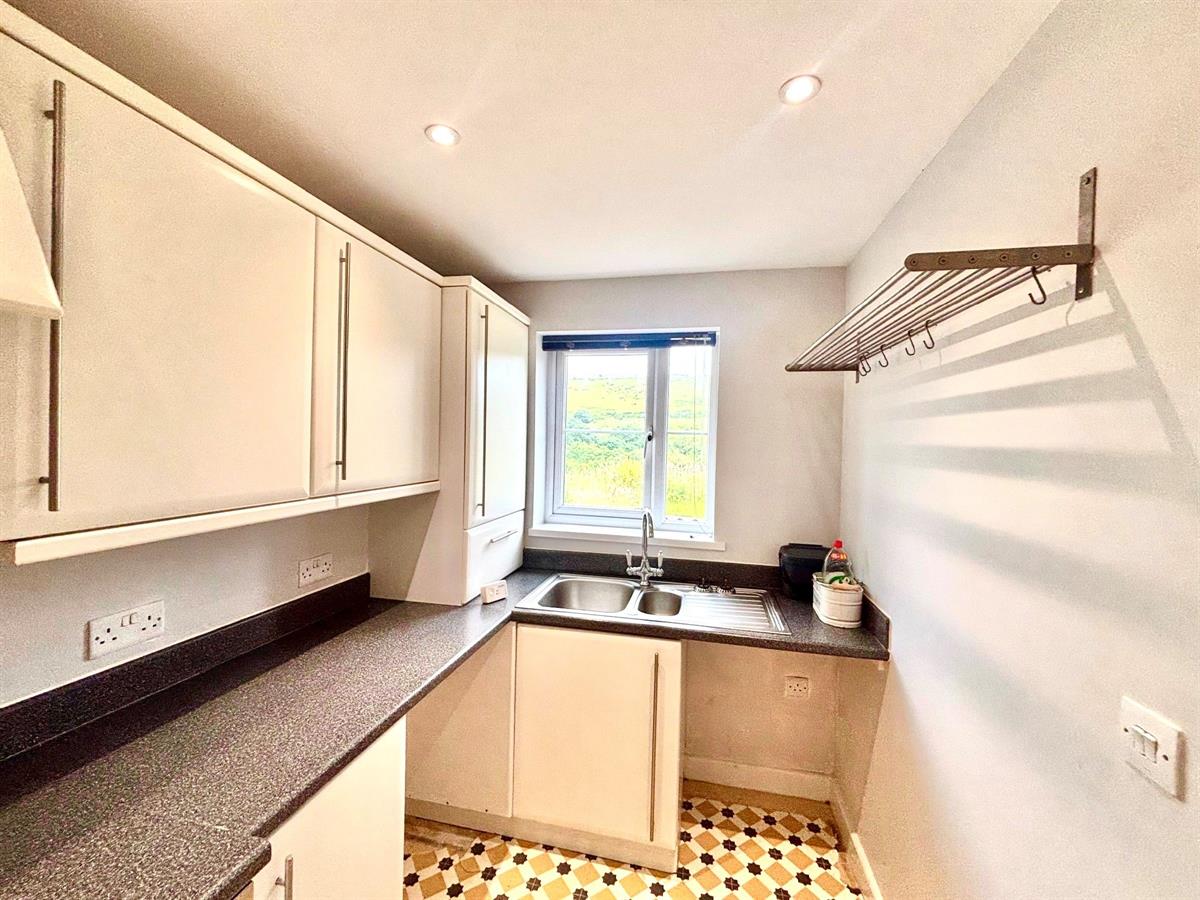UPVC double glazed window to front aspect, matching modern wall and base units, stainless steel sink/drainer, space for fridge/freezer, integrated gas hob and oven with extractor over, space for a table and chairs , plain walls, plain ceiling and vinyl flooring.