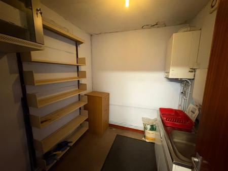 Brown door with silver handle on entry, white painted walls, a utility/storage room providing extra space, houses the boiler, silver sink with silver taps with white cabinets underneath.
