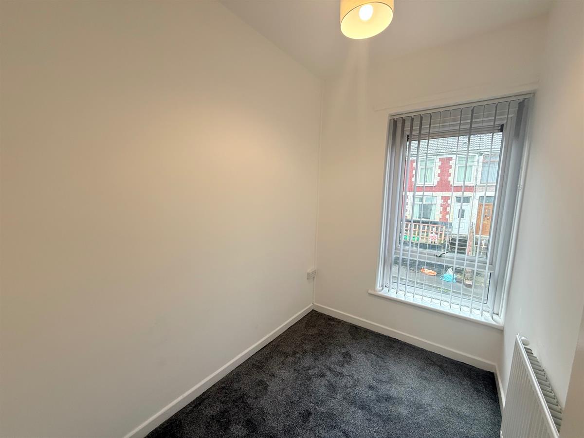 White door, grey carpet, white walls, white ceiling with pendant light, white radiator, white framed window looking to rear, 2 double plug sockets