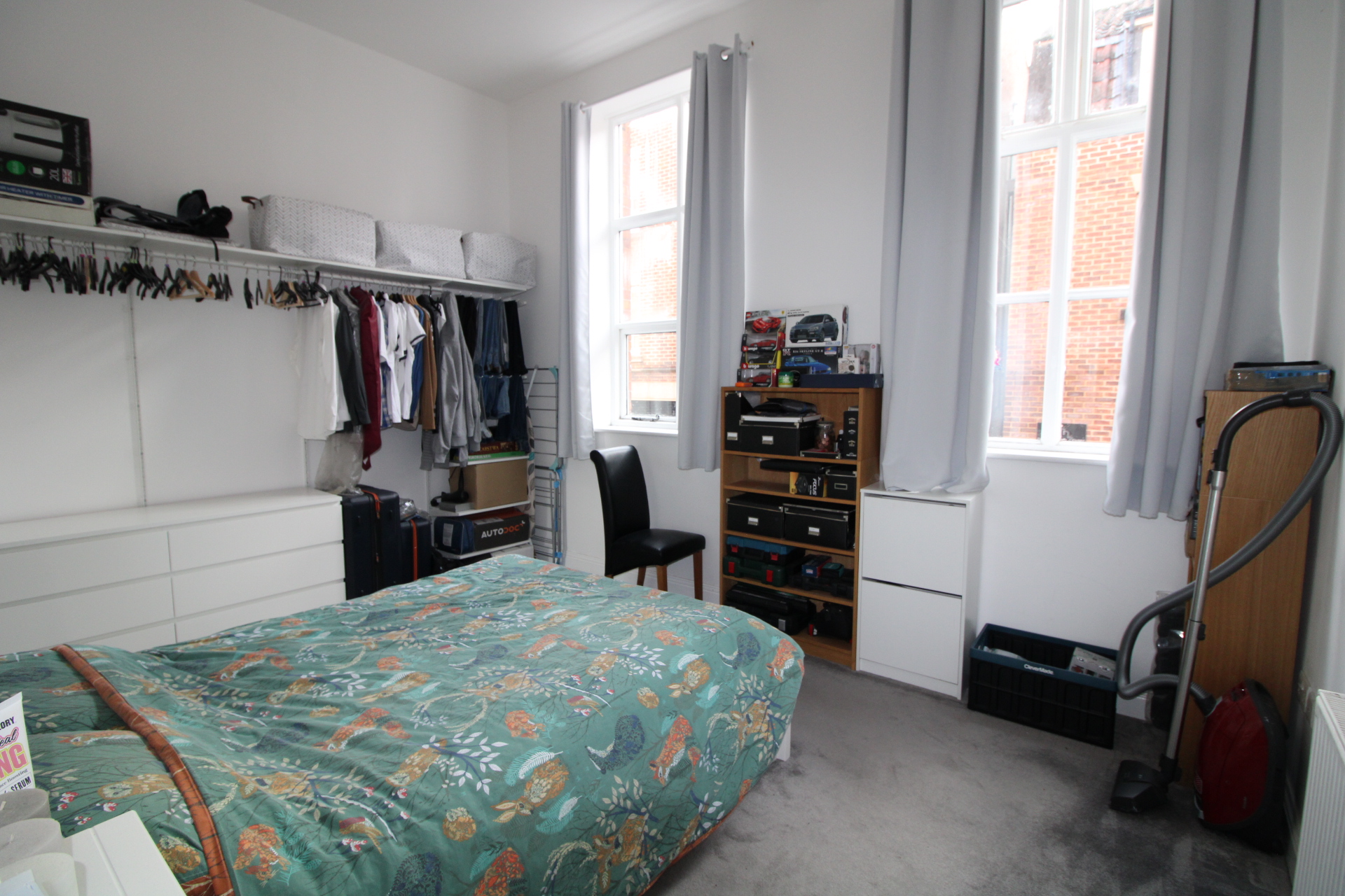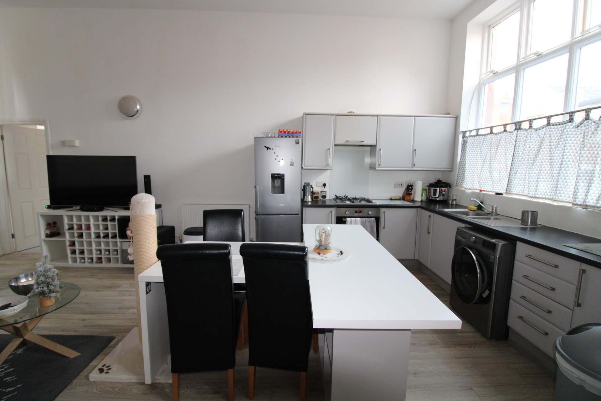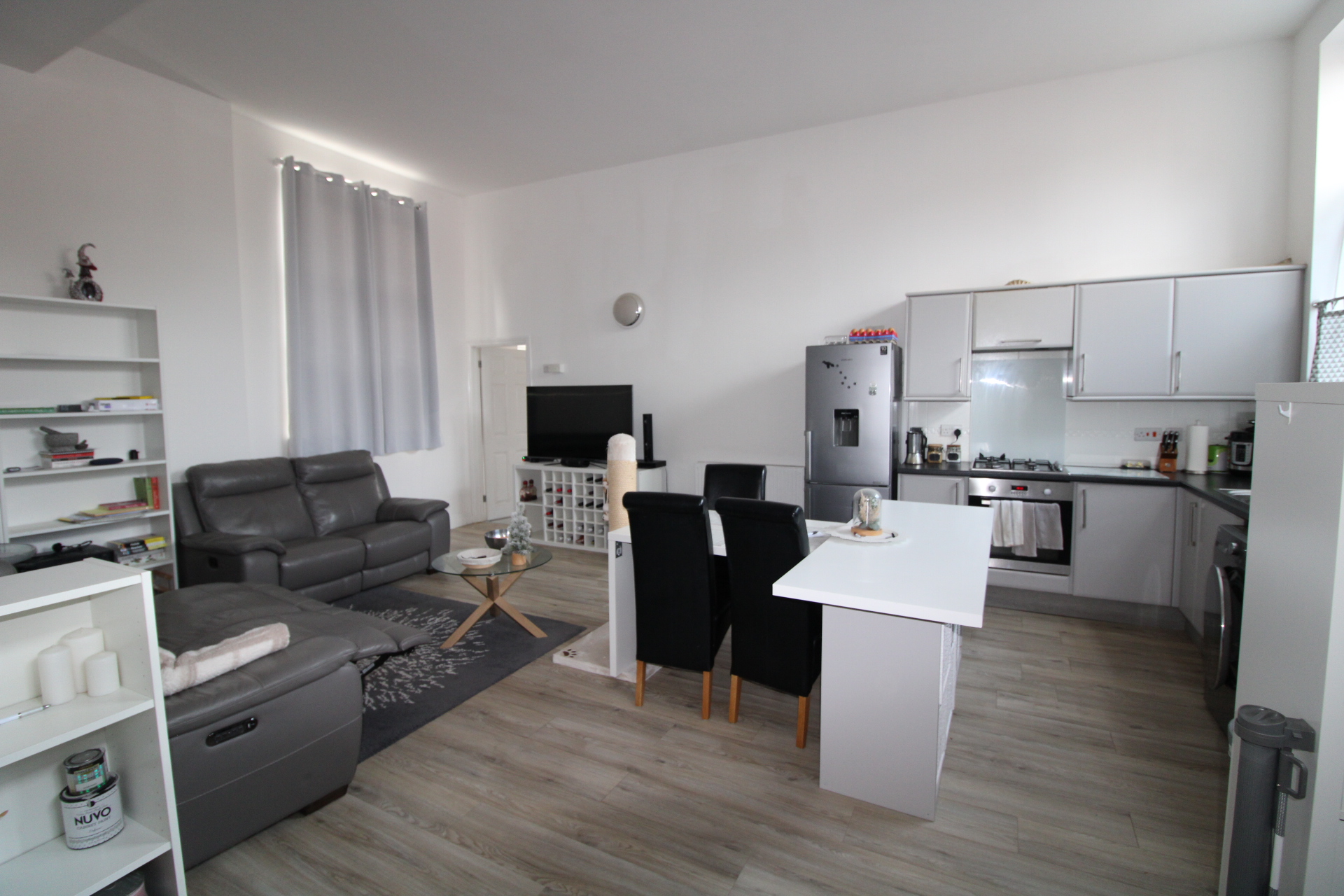 21’7” x 19’4” A spacious room with dual aspect windows. The kitchen area is fitted with a range of modern kitchen units and draws. Laminate worktops with inset stainless-steel sink. Integrated electric oven and Gas hob. Space for Washing Machine and Fridge Freezer. Combi boiler. The lounge area has ample space for two sofas and a tv unit.