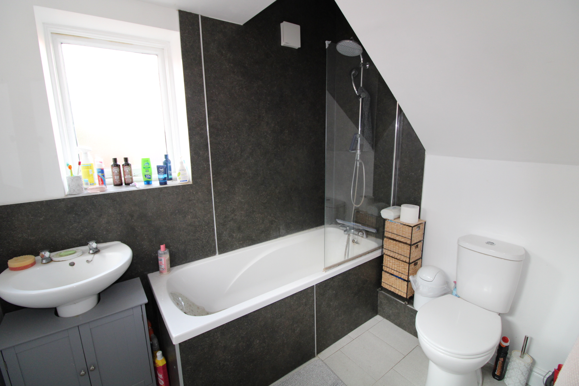 7’9” x 6’6” Fitted with a white WC, hand pedestal basin and panel bath with mains shower over.