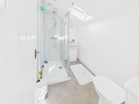Large shower cubicle with mains shower inset. Wash hand basin inset into vanity unit. Low level WC with concealed cistern. Chrome towel rail/radiator. Door to Hallway.