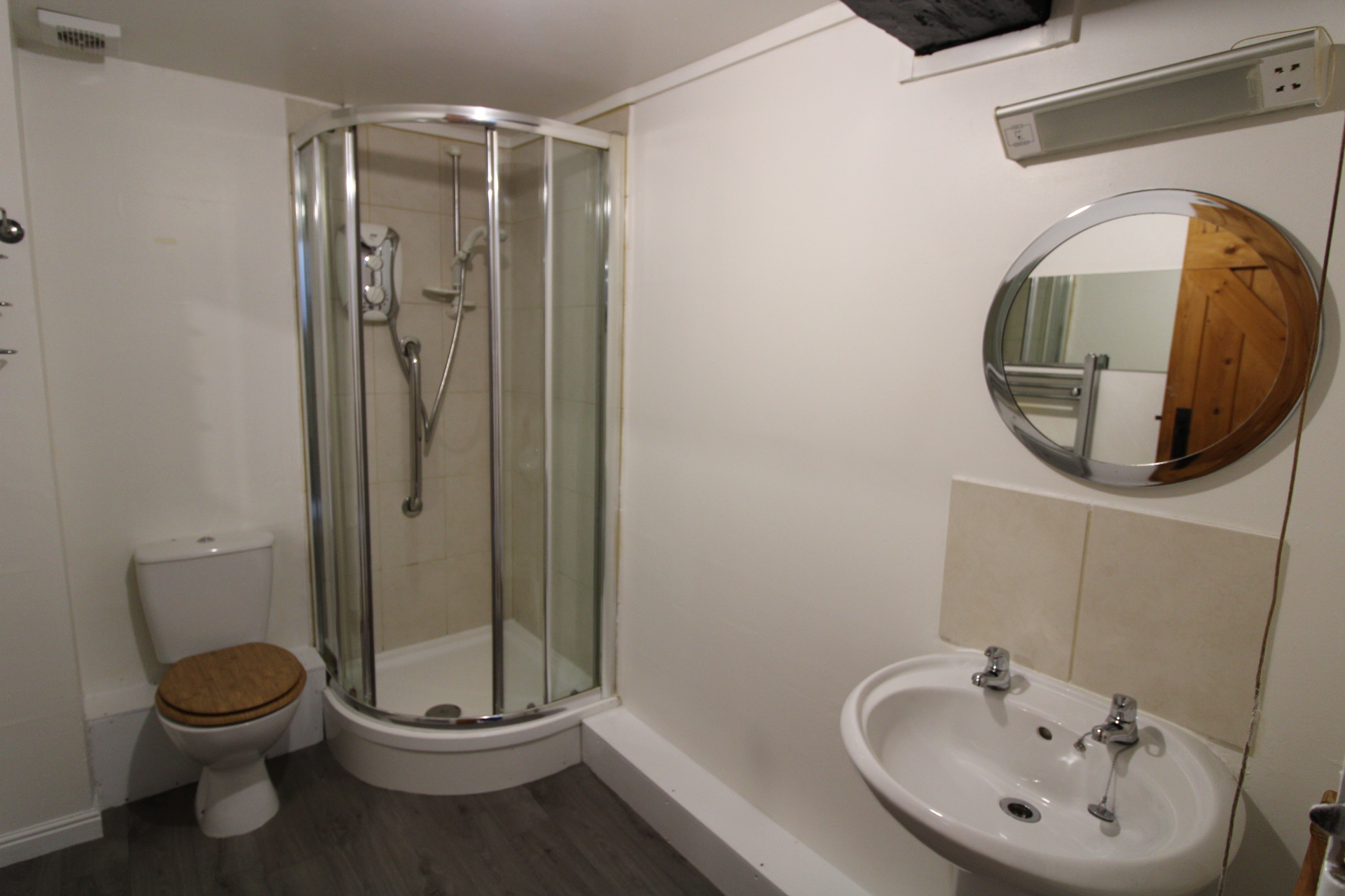 Fitted with a white suite comprising of WC, Pedestal hand basin and enclosed shower cubicle. Towel rail radiator. Panel mirror.