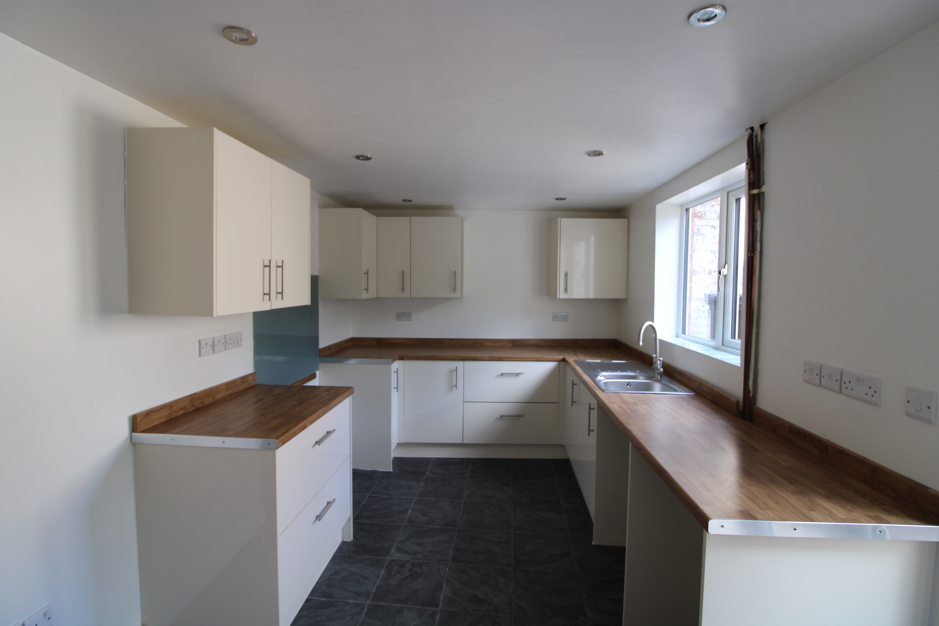 15’7” x 8’5”. Window to rear aspect. Newly decorated. Fitted with a range of modern units and drawers. Laminate work tops with inset stainless steel sink. Space for oven, fridge freezer, washing machine and tumble dryer. Breakfast bar. French doors leading to rear garden.