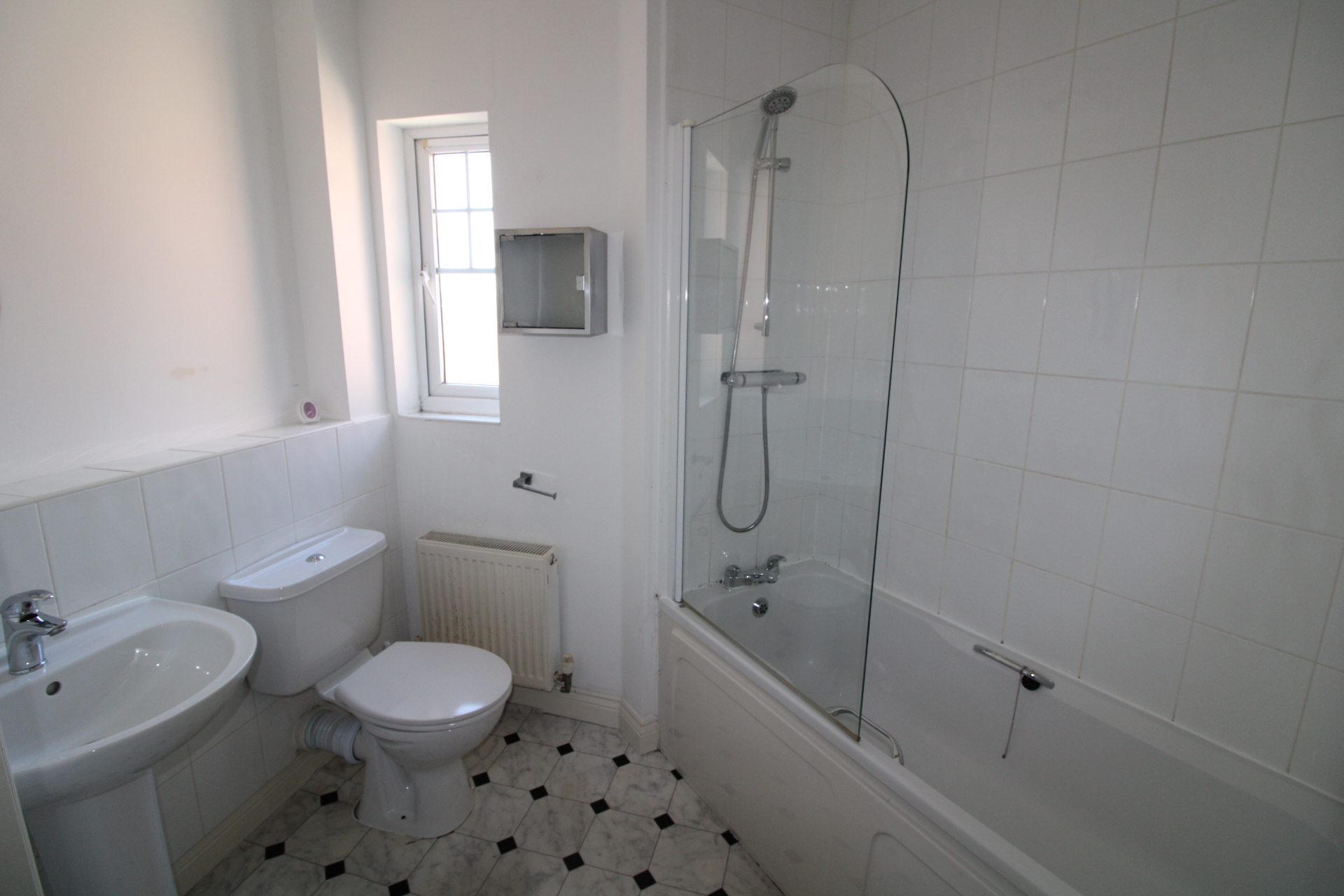 A well-presented family bathroom with a modern white suite comprising W.C, pedestal hand basin and panel bath with shower over.