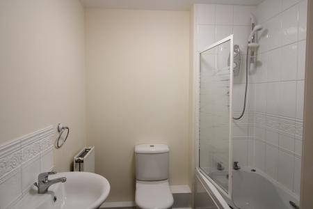 Fitted with a modern white suite comprising WC, pedestal wash hand basin and panel bath with shower over.