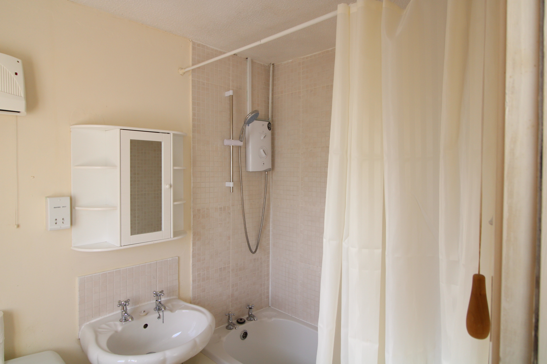 Fitted with white suite comprising WC, pedestal wash hand basin and panel bath with electric shower over.