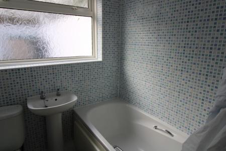 Fitted with a white suite comprising WC, pedestal hand basin and panel bath with electric shower over.