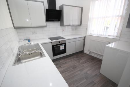 8’6” x 8’0 (2.60m x 2.44m) Equipped with a range of new units incorporating single drainer stainless steel sink unit inset into work surface with floor units and plumbing for washing machine under. Additional work surface with inset ceramic hob with oven below and contemporary extractor hood over. Additional floor units. Range of wall units. Radiator. UPVC double glazed sash style window overlooking front. Flooring.