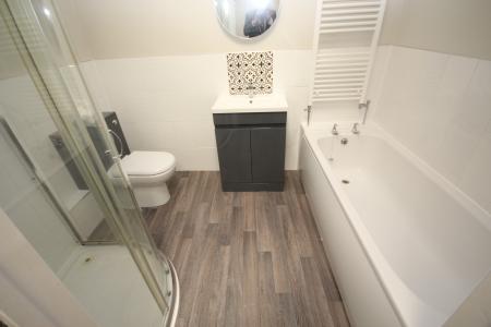 White suite comprising panelled bath. Wash hand basin inset into vanity unit. Low level WC. Corner shower cubicle with electric instant shower over. Radiator. Flooring. Velux roof light.